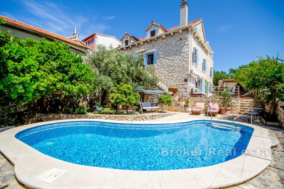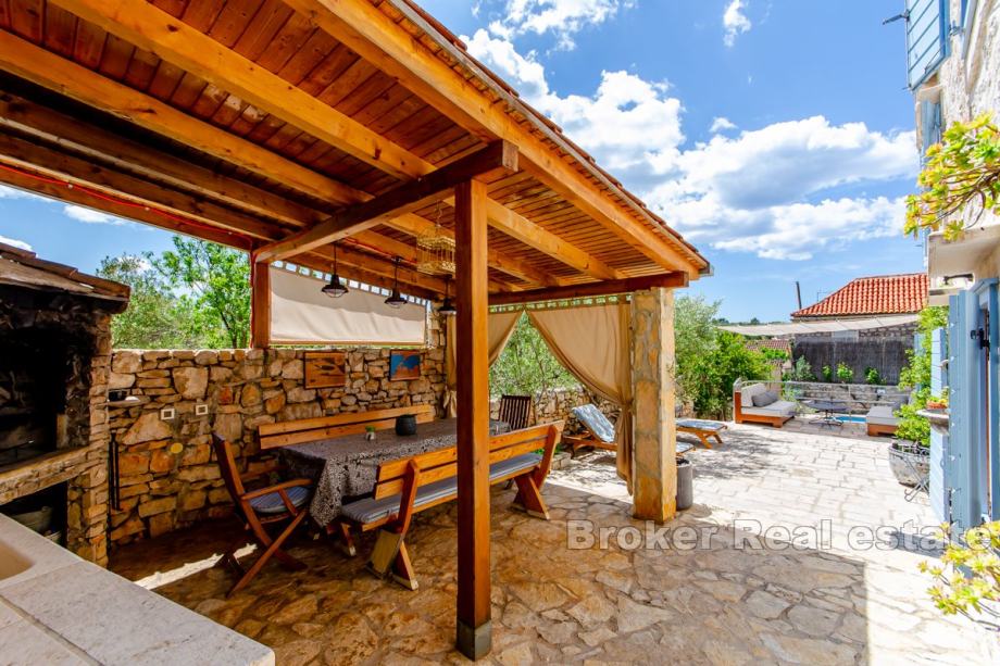 Prodaje se tradicionalno mediteransko uređena kamena vila (bruto površine 202 m2, a korisna površina je 145 m2), u malom pitoresknom mjestu na otoku Braču. Imanje uključuje šarmantan bazen nepravilnog oblika okružen vrtom popločanim kamenom. Bujno zelenilo i stabla pružaju hladovinu i privatnost oko bazena i vrta, uključujući pergolu na gornjoj terasi, idealnu za objedovanje i opuštanje na otvorenom.