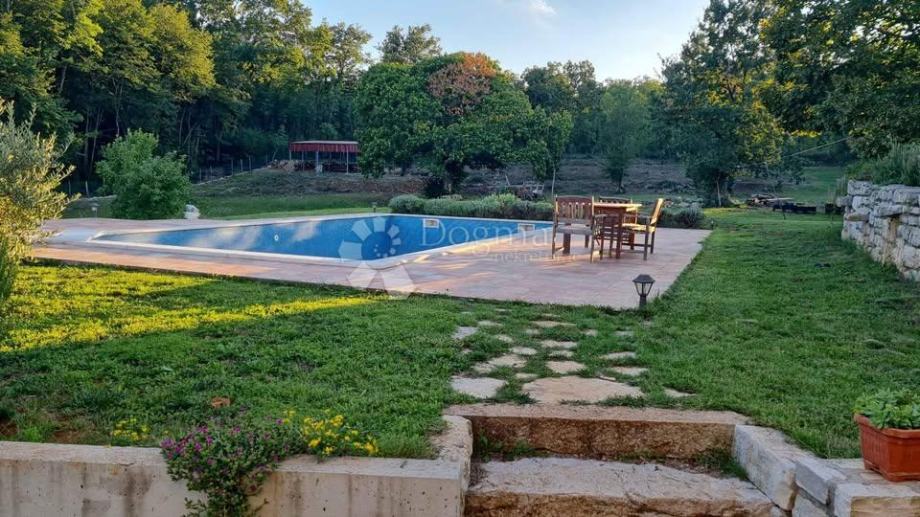 Ujedno ovu nekretninu krase bazen ( 10x5 dimenzija,skimerski) , vrtna okućnica od 4.690 m2 , dva gospodarska objekta od 60 m2 i 40 m2. Jedan od objekata je preuređen kompleto za život (namješteno sa kuhinjom, WC-om i spavaćom sobom 60 m2), dok drugi je trenutačno u funkciji skladišta ili može poslužiti kao garaža (40 m2). Također na okućnici je dostupan i veliki parkirni prostor nenatkriveni za 5 do 7 auta.
