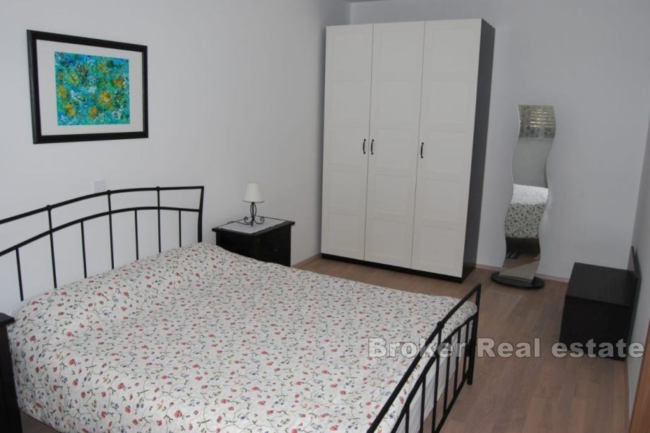 Ova vila se proteže na dvije etaže. Na donjoj etaži nalaze se dvije garaže, od kojih jedna ima izravan pristup u stan površine 60 m². Stan uključuje prostrani hodnik, moderno opremljenu kupaonicu, zasebni WC za goste, dvije udobne spavaće sobe te prostrani otvoreni prostor koji povezuje dnevni boravak, blagovaonicu i kuhinju. Stan ima izlaz na natkrivenu terasu koja vodi do bazena sa staklenom kupolom, osiguravajući ugodno korištenje bazena tijekom cijele godine.