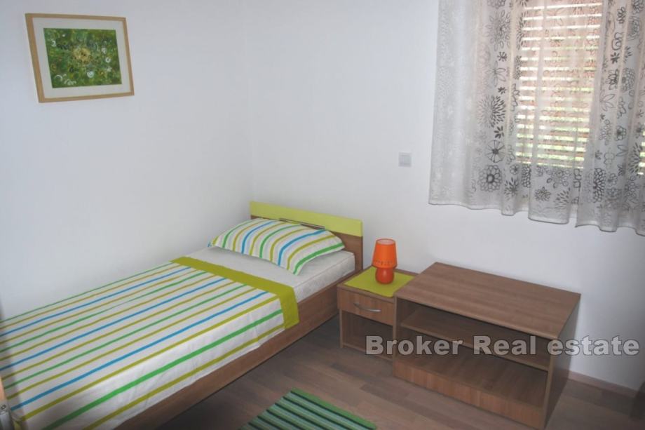 Na gornjoj etaži nalaze se četiri prostrane spavaće sobe, svijetao dnevni boravak, potpuno opremljena kuhinja s blagovaonicom, glavna kupaonica i dodatni WC. Dnevni boravak izlazi na prostranu terasu s prekrasnim pogledom na okolnu prirodu.