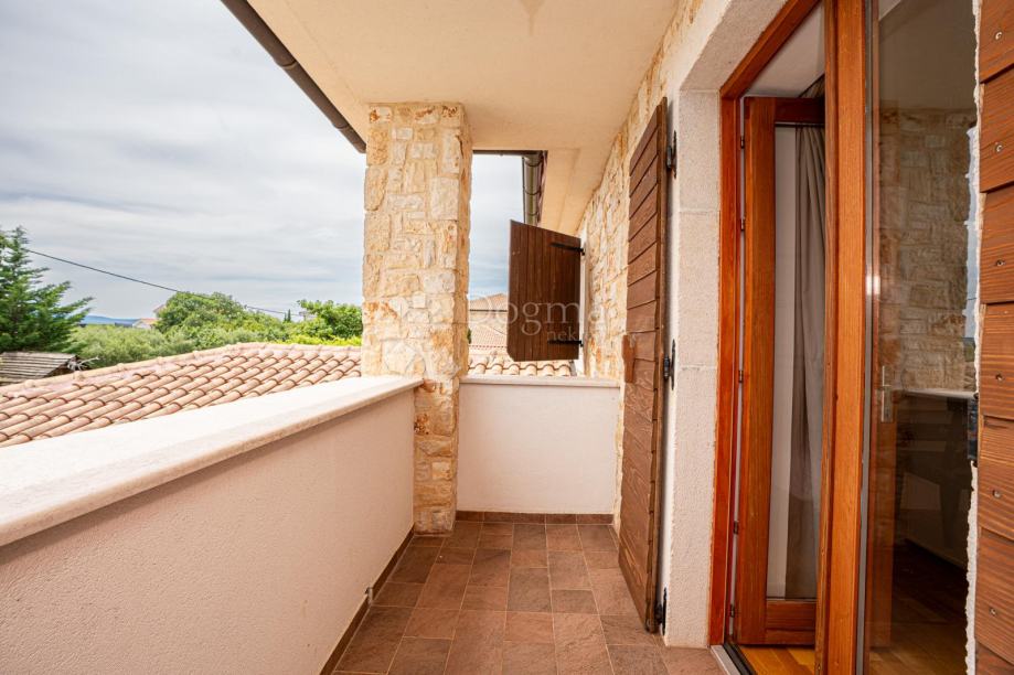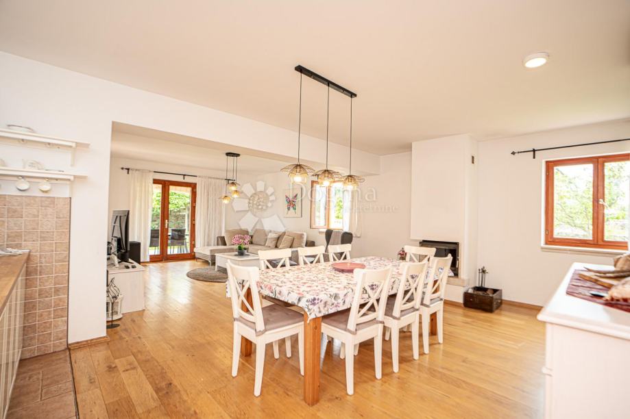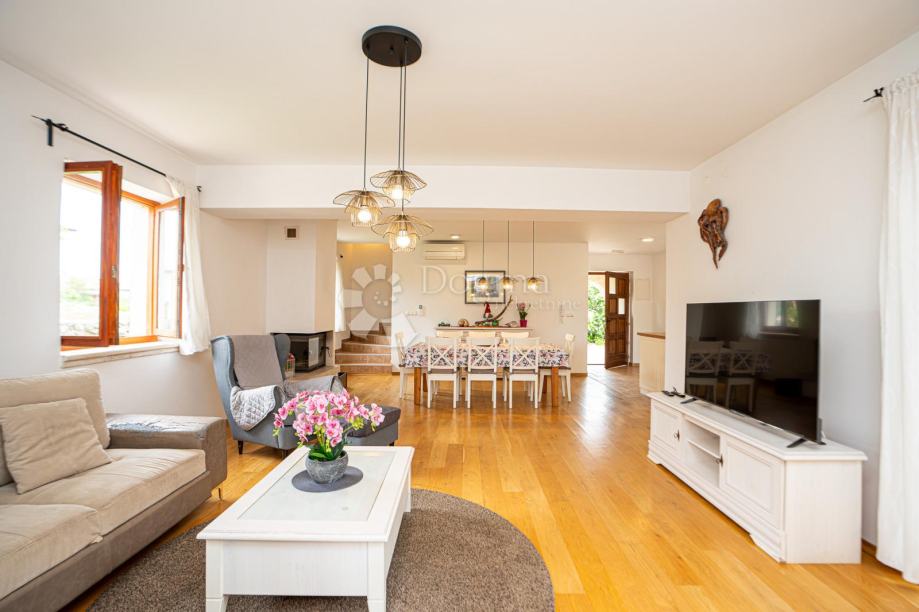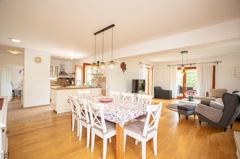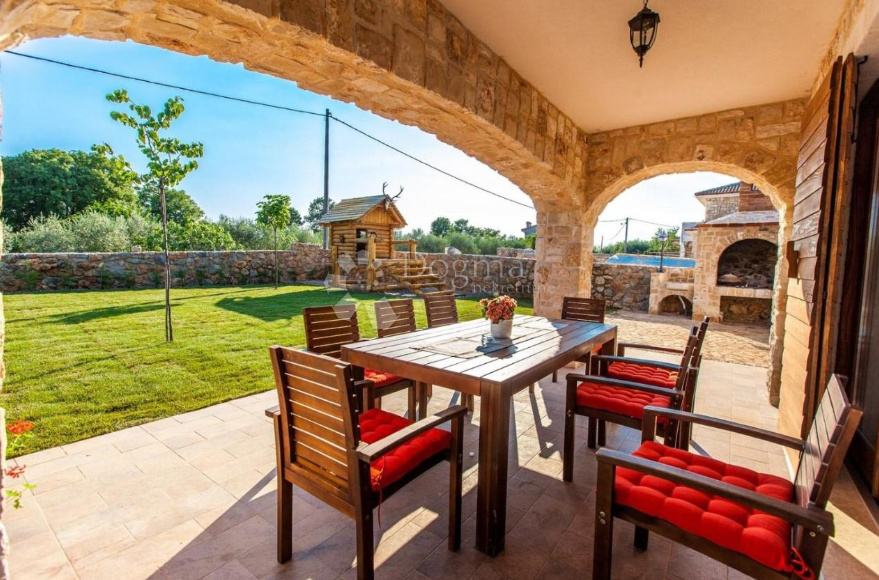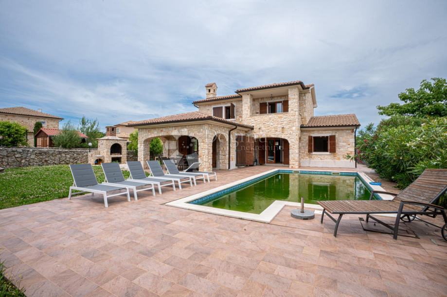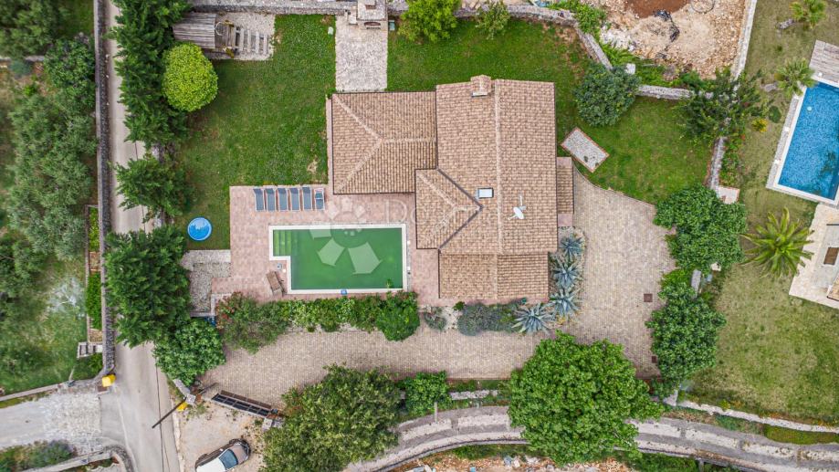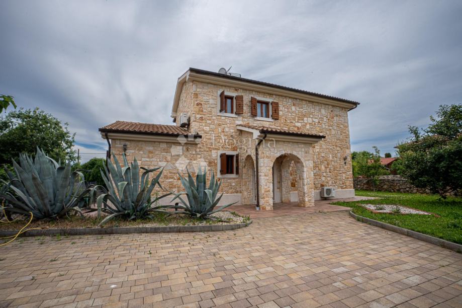 To je samostojeća kamena kuća na parceli od 950 m2. Na prostranom vrtu, ispred kuće je bazen sa sunčalištem. Okoliš je lijepo uređen i zasađen mediteranskim biljem. U njega je uklopljen veliki vanjski kamin, a ispred kuće je natkrivena popločana terasa sa vanjskim blagovaonski stolom. Nekretnina je totalno okružena zidovima, ispred kapijom unutar koje imamo više parkirnih mjesta . Sama kuća pruža nam 150 m2 stambenog prostora. U prizemnom dijelu nalazi se, u open space varijanti, prostrani dnevni dio sa kuhinjom, blagovaonom i dnevnim boravkom, te spremištem. Unutarnjim stepenicama penjemo se na prvi kat koji se sastoji od spavaćeg dijela, podijeljenog u 3 spavaće sobe, svaka sa svojom kupaonom. Jedna od soba ima i izlaz na balkon sa pogledom na cijeli okoliš. Prostor je klimatiziran