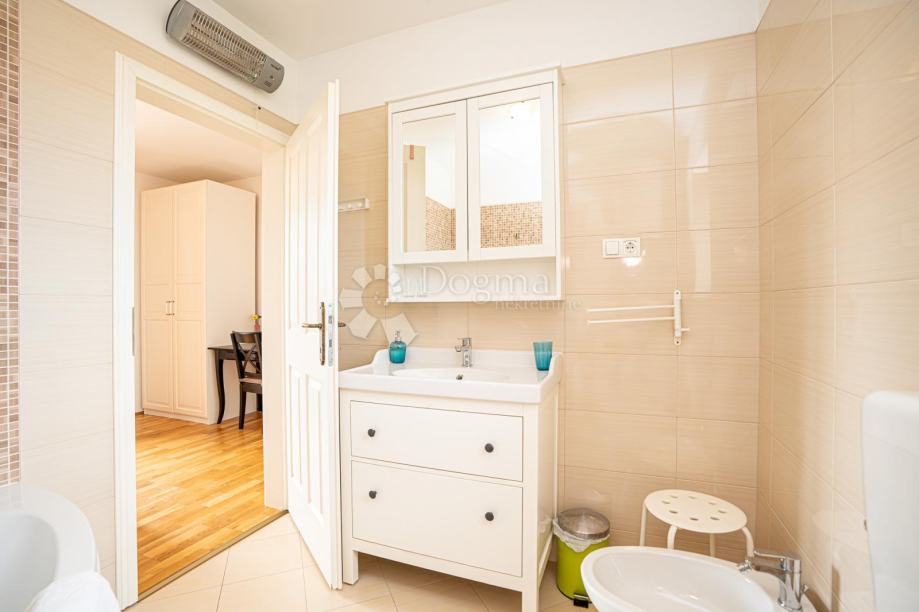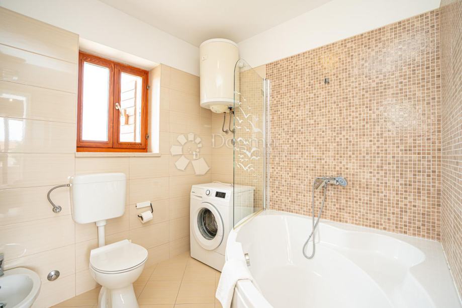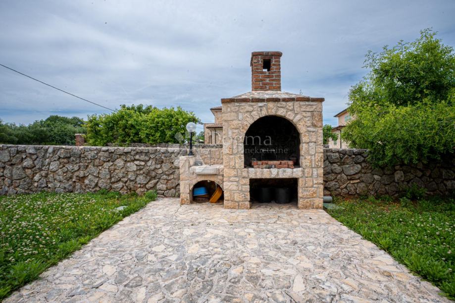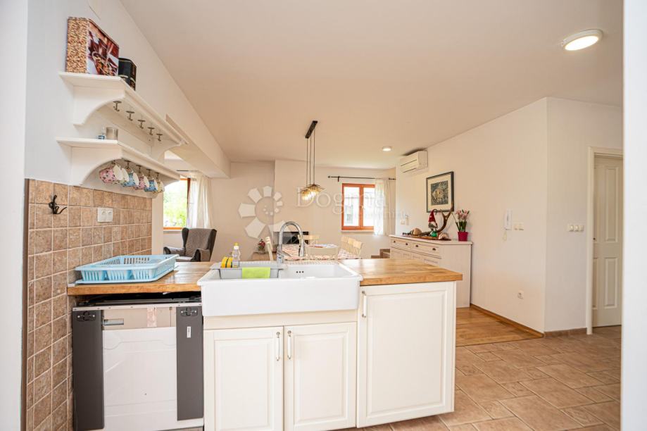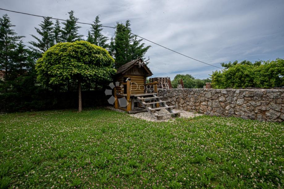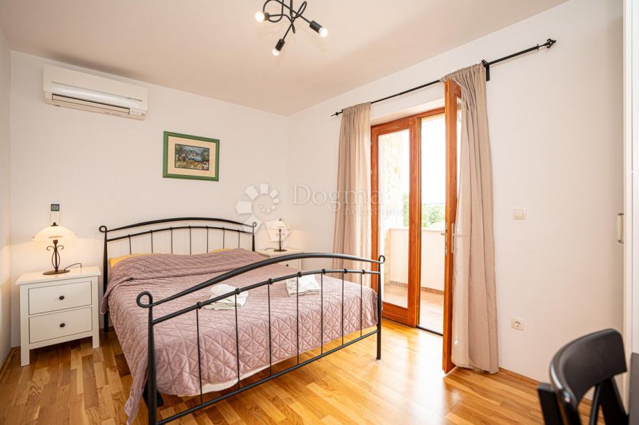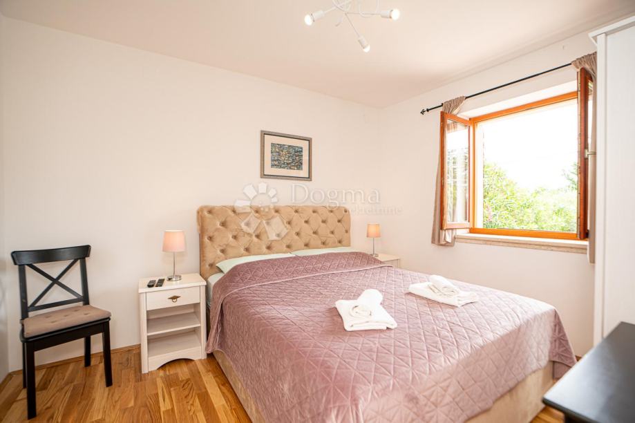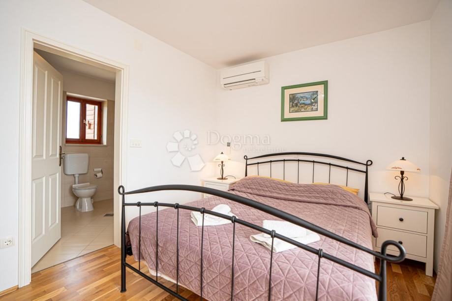 To je samostojeća kamena kuća na parceli od 950 m2. Na prostranom vrtu, ispred kuće je bazen sa sunčalištem. Okoliš je lijepo uređen i zasađen mediteranskim biljem. U njega je uklopljen veliki vanjski kamin, a ispred kuće je natkrivena popločana terasa sa vanjskim blagovaonski stolom. Nekretnina je totalno okružena zidovima, ispred kapijom unutar koje imamo više parkirnih mjesta . Sama kuća pruža nam 150 m2 stambenog prostora. U prizemnom dijelu nalazi se, u open space varijanti, prostrani dnevni dio sa kuhinjom, blagovaonom i dnevnim boravkom, te spremištem. Unutarnjim stepenicama penjemo se na prvi kat koji se sastoji od spavaćeg dijela, podijeljenog u 3 spavaće sobe, svaka sa svojom kupaonom. Jedna od soba ima i izlaz na balkon sa pogledom na cijeli okoliš. Prostor je klimatiziran