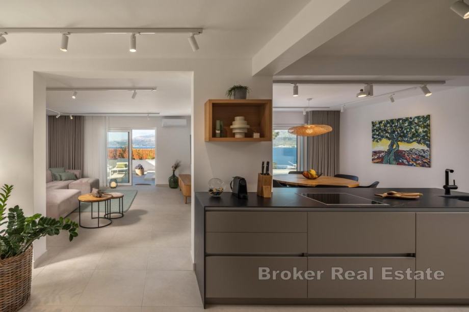 Eksterijerom dominira bazen , odnosno vanjska blagovaonica s roštiljem u kojoj se može uživati u ljetnim večerima dok kaskadna pozicija vile osigurava predivan pogled na more.
