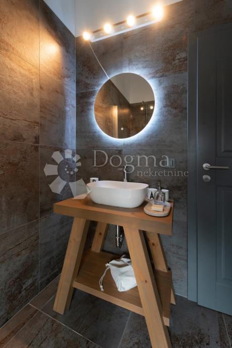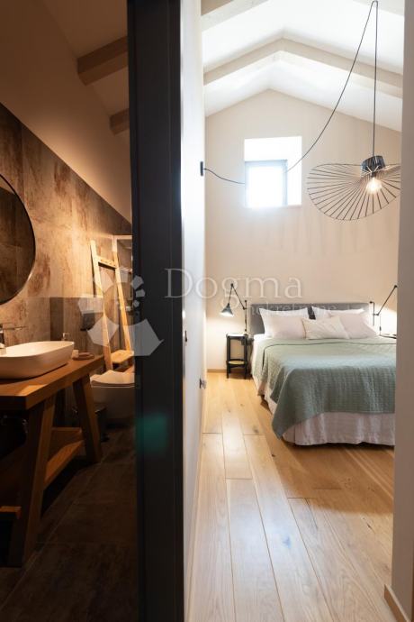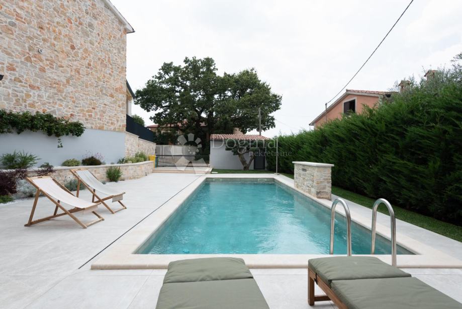 Kuća se sastoji od dnevnog boravka, kuhinje, prostranih spavaćih soba i elegantno uređenih kupaonica, pružajući sav potreban komfor. Privatni vrt površine 980 m2 s bazenom dimenzija 12.80 m x 3.50 m pruža savršeno mjesto za opuštanje i uživanje u prirodnom okruženju. U dvorištu se nalazi i mali maslinik. Uz kuću dolaze tri parkirna mjesta, što dodatno doprinosi praktičnosti i komforu.