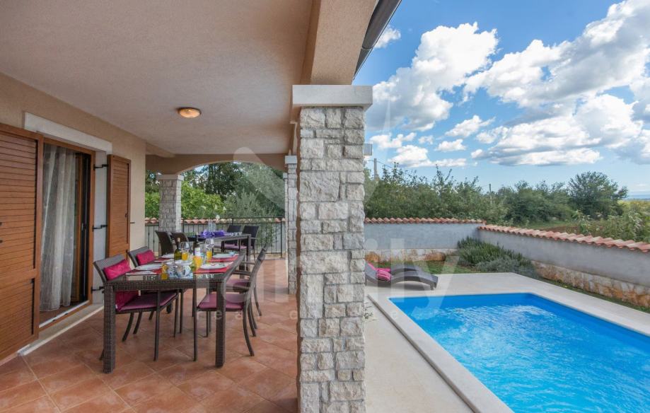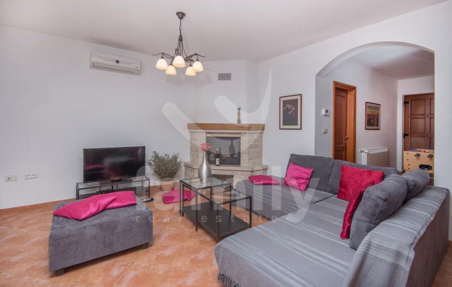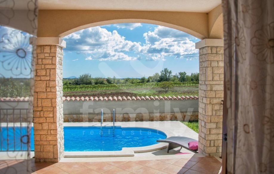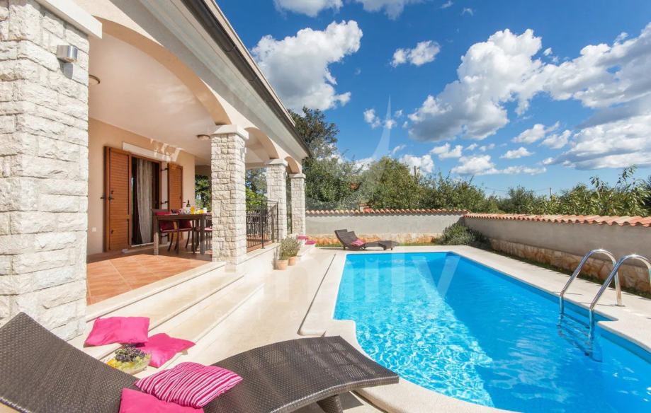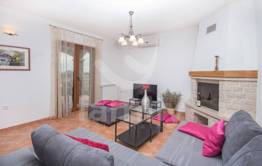 Upravo u jednom naselju nedaleko od Filipane smjestila se ova prekrasna villa površine 175 m2 sa okućnicom od 225 m2. Proteže se na dvije etaže - u prizemlju se nalazi prostrani dnevni boravak sa kaminom i stolnim nogometom, kupatilom, prostranom kuhinjom i prostorom za ručavanje te izlazom na veliku terasu koja je površine oko 40 m2 i stolom za osam osoba, sa pogledom na prirodu gdje se nalazi i bazen i vanjski kamin. Stepenice koje vode do prvog kata su kamene i na prvome katu se nalaze tri prostrane spavaće sobe od kojih svaka ima izlaz na zajedničku terasu površine oko 40 m2. Na prvome katu je i prostrana kupaonica sa kadom, kao i prostor za pranje robe. U kući je postavljena PVC stolarija boje oraha sa dvoslojnim staklom i griljama, a sustav grijanja i hlađenja reguliran je sa dvije jedinice klima uređaja, dok je mogućnost grijanja predviđena osim kaminom i centralnim grijanjem na plin, a plinska boca je velikog kapaciteta i podzemna je. Na okućnici se nalazi vanjska ostava i garaža iz koje se može izaći u dvorište. Kuća je spoljašnjim dijelom obložena kamenom i termoizolacijom 8 cm što dodatno povećava energetsku efikasnost. Vila se godinama uspješno iznajmljuje tijekom turističke sezone.