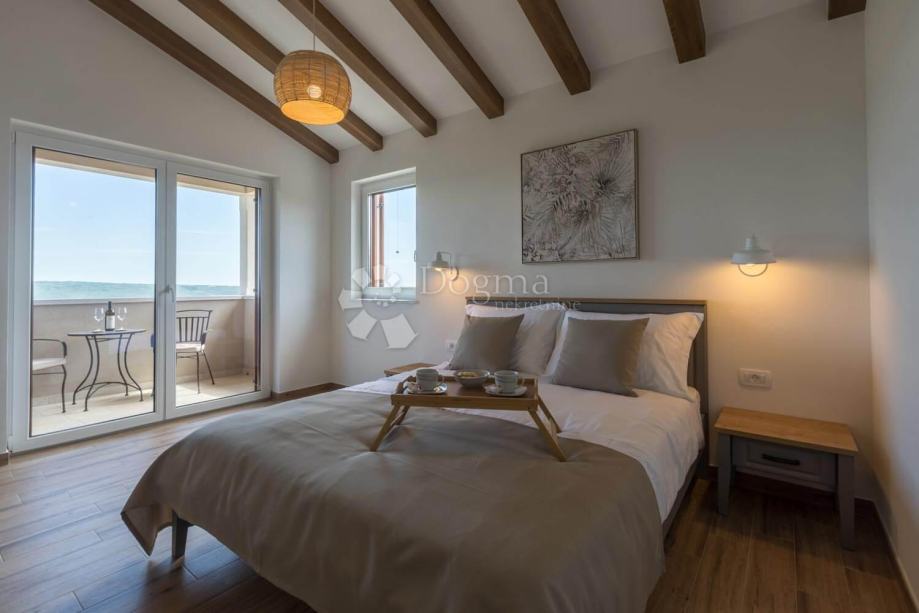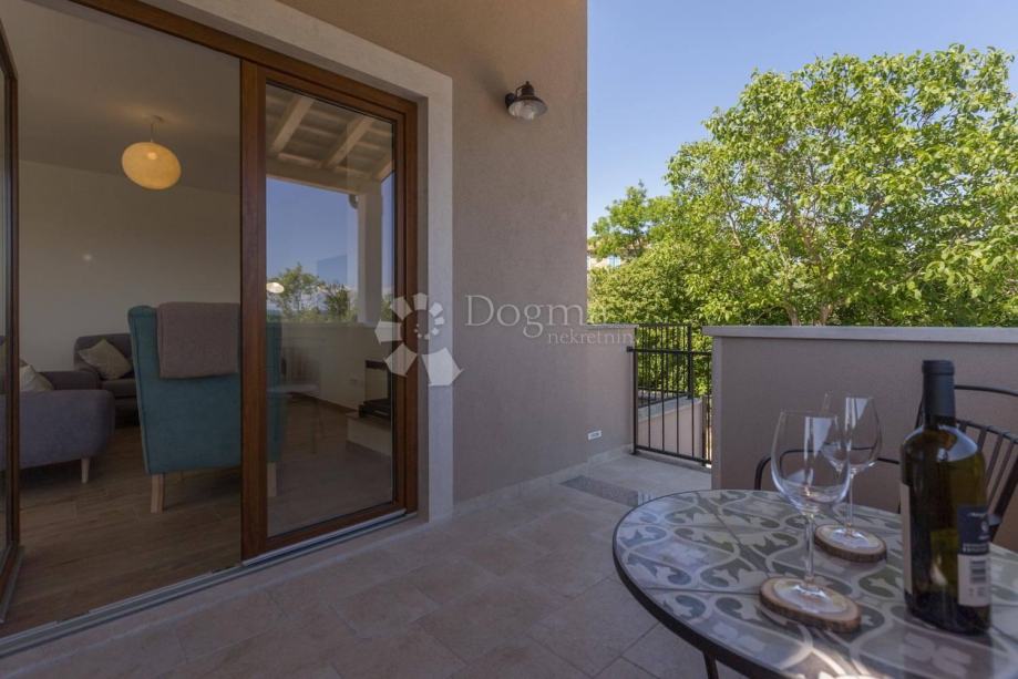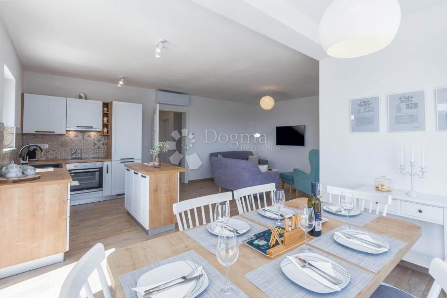 Iz dnevnog boravka direktno se izlazi na terasu sa koje se pruža nezaboravan pogled na more i mnoštvo zelenila.