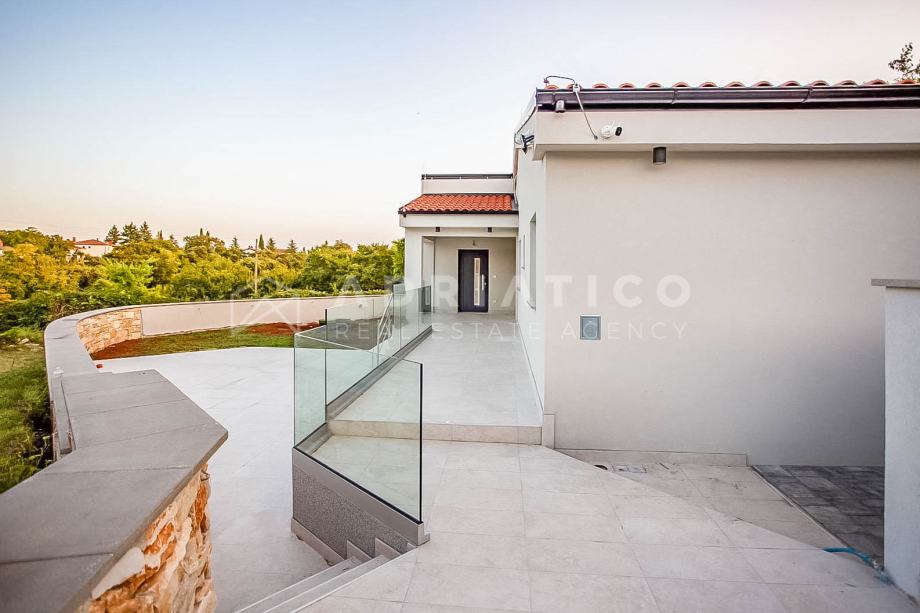 U mirnom i uređenom naselju nedaleko Rovinja i Kanfanara, prodaje se moderna prizemna niskoenergetska kuća, ukupne površine 147 m².