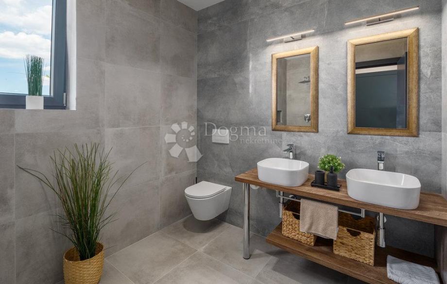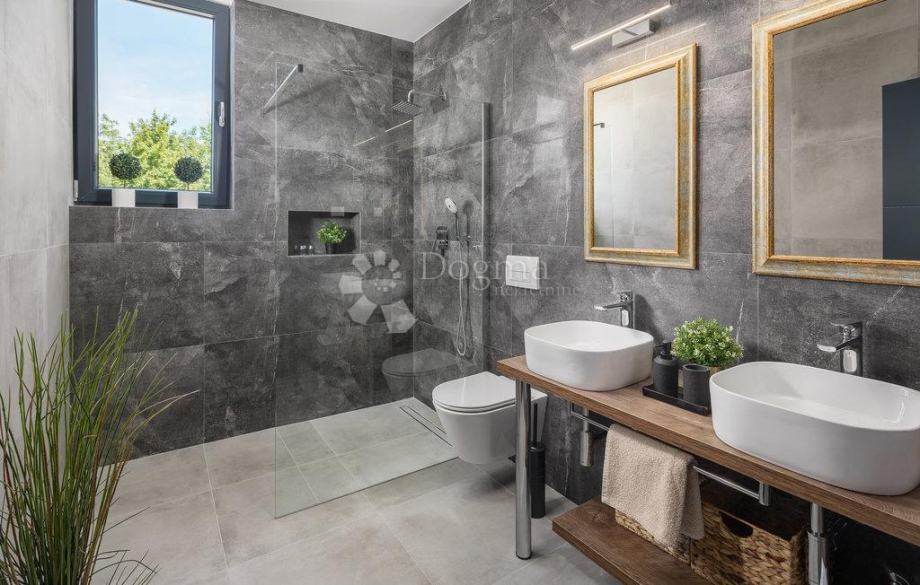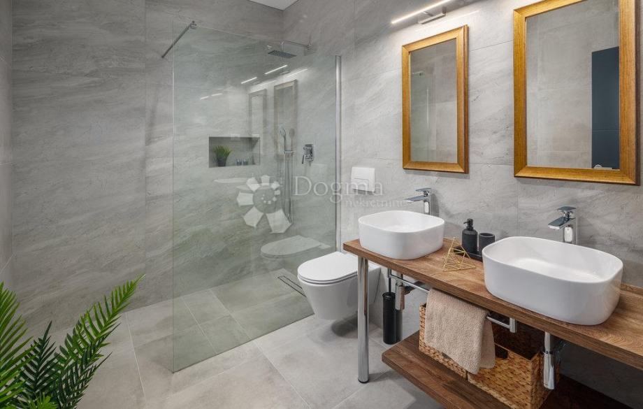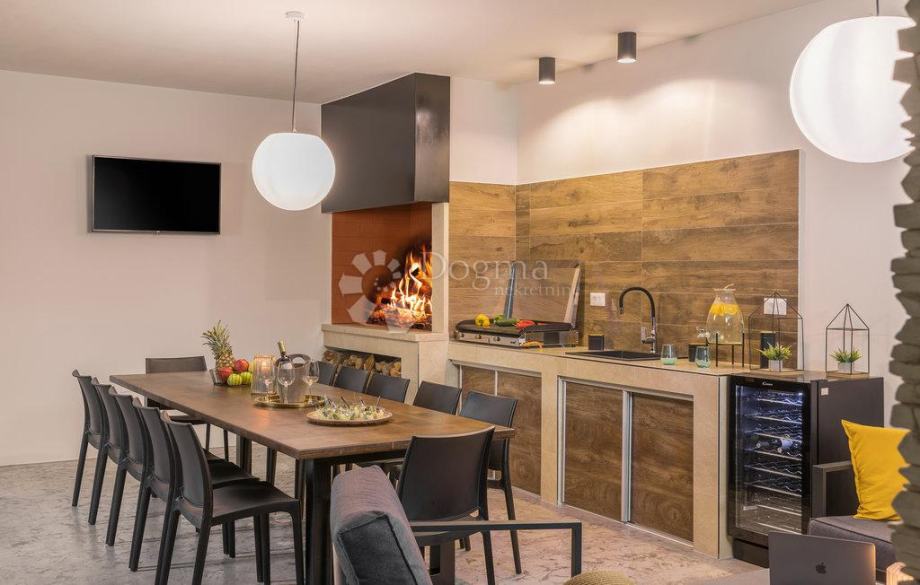 Interijer ove luksuzne vile pomno je dizajniran kako bi pružio maksimalnu udobnost i funkcionalnost. Grijanje je riješeno podnim grijanjem s dizalicom topline, što jamči visoku energetsku učinkovitost i ugodan boravak kroz cijelu godinu. Svaka prostorija opremljena je klima uređajem, osiguravajući savršenu temperaturu unutar kuće bez obzira na sezonu. U prostranom dnevnom boravku smješten je kamin, koji nije samo ukras, već i funkcionalan element koji doprinosi stvaranju tople, ugodne atmosfere, idealne za opuštanje i obiteljska okupljanja.