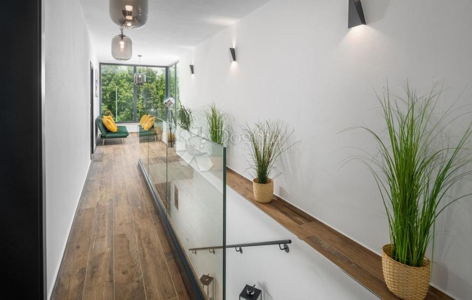 Kuća je opremljena vrhunskim materijalima i modernim uređajima, a prostorije su osmišljene s posebnim naglaskom na svjetlost i prozračnost. Veliki stakleni prozori omogućuju obilje prirodnog svjetla te pružaju pogled na šumoviti okoliš, stvarajući savršen ambijent za opuštanje i uživanje u prirodi.