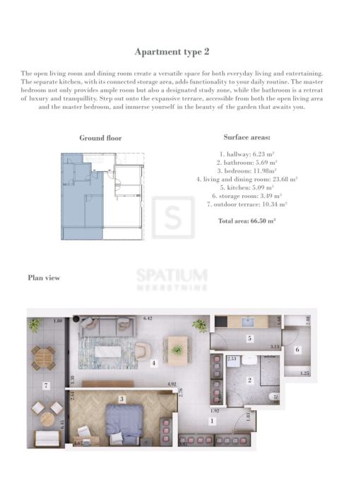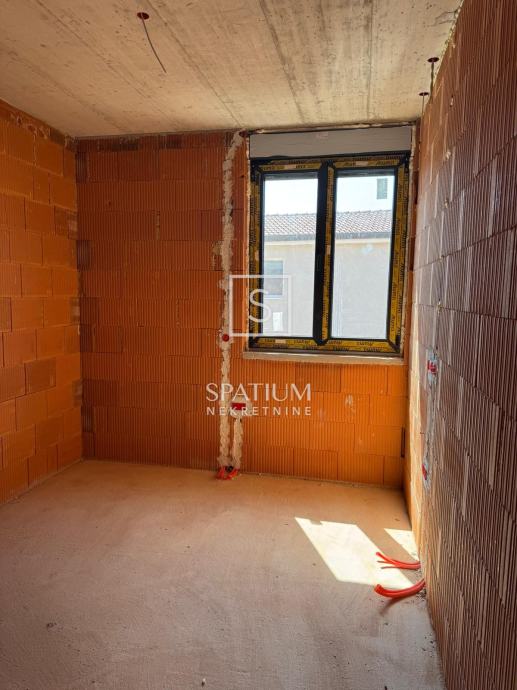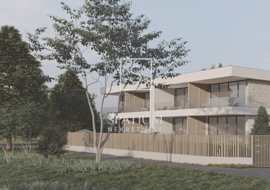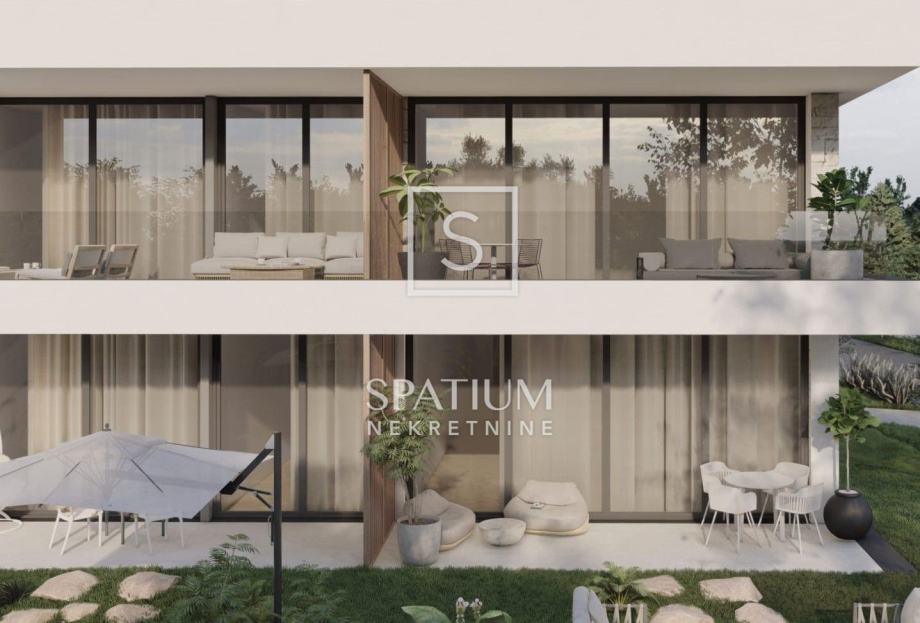 Stan se odlikuje modernim dizajnom, vrhunskim materijalima i kvalitetnom opremom, uključujući multi-split sustav za grijanje i hlađenje, podno grijanje u kupaonici i kuhinji, te elegantne talijanske pločice u cijelom stanu. Ispred stana nalazi se privatno dvorište s terasom, idealno za uživanje na otvorenom, dok jedno osigurano parkirno mjesto pruža dodatnu praktičnost. Osim toga, na parceli su predviđena tri električna punjača za vozila, čime se omogućava ekološki prihvatljiv način punjenja automobila.