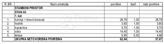 Stan “A3” smješten u prizemlju, ukupne netto površine sa koeficijentima 57.47 m² sa izvrsno osmišljenim rasporedom: