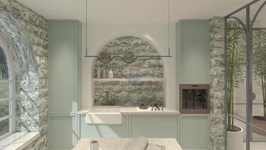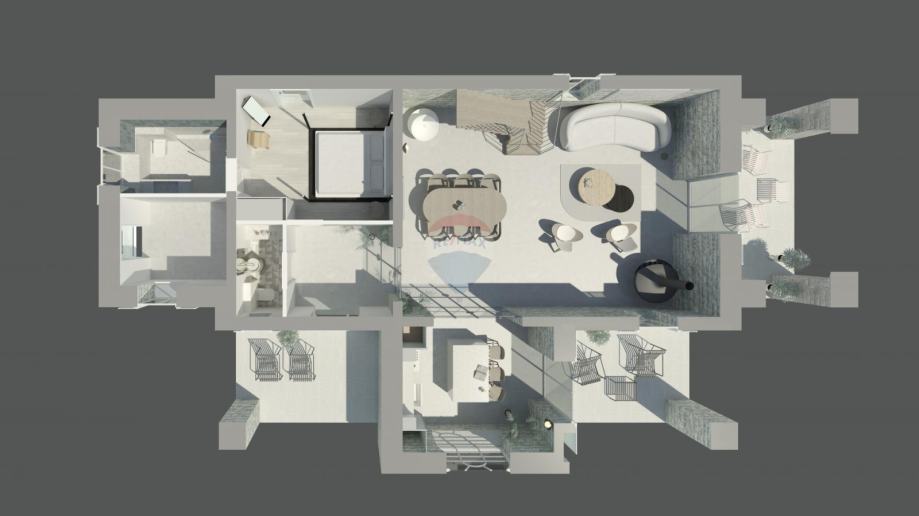 Kuća je ukupne površine 215 m2 a proteže se na dva kata te ljetna kuhinja od 50 m2.