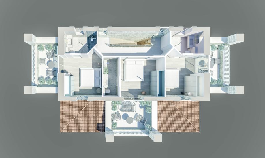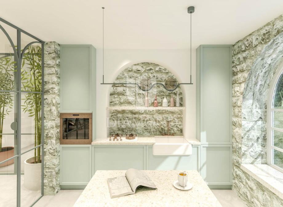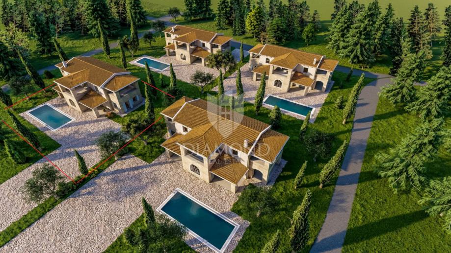 Ova kamena kuća sastoji se od dvije etaže gdje se u prizemlju nalazi ulazni hodnik, dnevni boravak sa izlazom na natkrivenu terasu te je spojen sa blagovaonicom i kuhinja koja je odvojena staklenom stijenom te ima također izlaz na natkrivenu terasu. Dodatni detalji u dnevnom boravku su potpuno funkcionalni kamin za grijanje u hladnijim mjesecima i stepenište koje vodi na gornju etažu. U nastavku prizemlja se nalazi također jedna spavaća soba sa vlastitom kupaonicom, gostinjski wc i kotlovnica koja ima ulaz sa vanjske strane kuće. Na gornjoj etaži su tri spavaće sobe sa vlastitim kupaonicama i natkrivenim terasama. U sklopu okućnice se nalazi i bazen sa sunčalištem te parking za dva osobna automobila.
