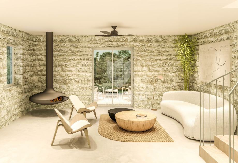 Ova kamena kuća sastoji se od dvije etaže gdje se u prizemlju nalazi ulazni hodnik, dnevni boravak sa izlazom na natkrivenu terasu te je spojen sa blagovaonicom i kuhinja koja je odvojena staklenom stijenom te ima također izlaz na natkrivenu terasu. Dodatni detalji u dnevnom boravku su potpuno funkcionalni kamin za grijanje u hladnijim mjesecima i stepenište koje vodi na gornju etažu. U nastavku prizemlja se nalazi također jedna spavaća soba sa vlastitom kupaonicom, gostinjski wc i kotlovnica koja ima ulaz sa vanjske strane kuće. Na gornjoj etaži su tri spavaće sobe sa vlastitim kupaonicama i natkrivenim terasama. U sklopu okućnice se nalazi i bazen sa sunčalištem te parking za dva osobna automobila.