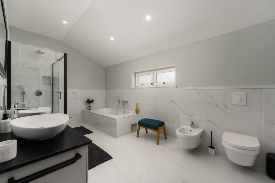 Sanitarije i slavine su GROHE i Villeroy & Boch.