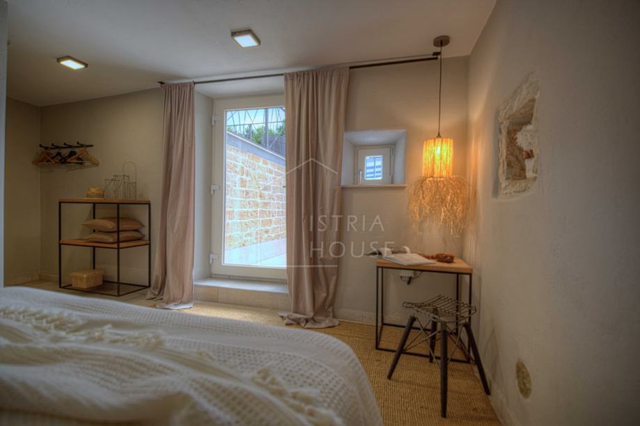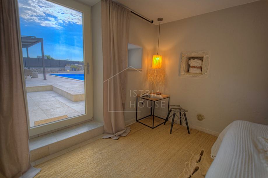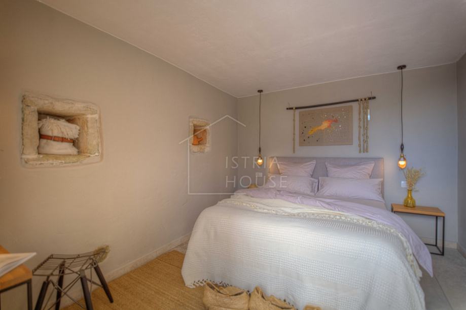 Prodaje se autohtona kamena kuća s bazenom uređena vrhunskim dizajnom koja se nalazi u okolici Kanfanara. Kuća ima 137 m2 a proteže se na dvije etaže. U prizemlju se nalazi otvorena kuhinja s dnevnim boravkom, spavaća soba s vlastitim kupatilom, vanski wc za goste, kotlovnica i prostrana ljetna kuhinja pokraj bazena. Na katu se nalaze dvije spavaće sobe također svaka sa svojim kupatilom te izlazom na otkrivenu terasu s koje se pruža otvoreni pogled, a u daljini se nadzire i more. U odlično uređenoj i potpuno ograđenoj okućnici nalazi se bazen sa brojnim mediteranskim elementima i biljkama. Kuća je opremljena klima uređajima, podnim grijanjem u kupatilima, solarnim panelima za grijanje vode te grijani bazen. U dvorište se nalazi i parkiralište za dva auta.