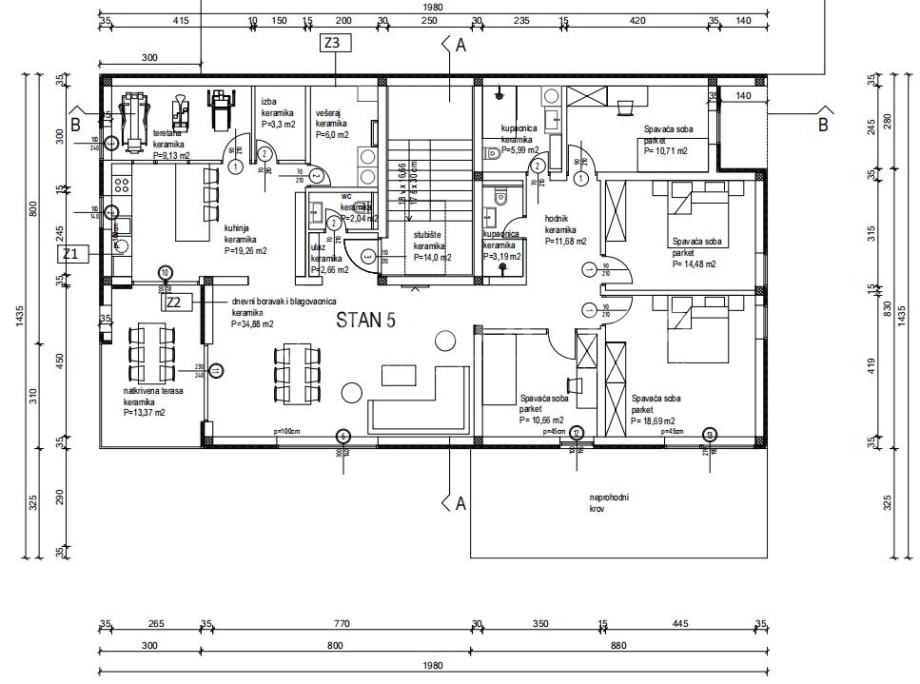 Penthouse će zauzimati cijeli drugi kat zgrade, prostirati će se na 166,04m2 površine te će se sastojati od: