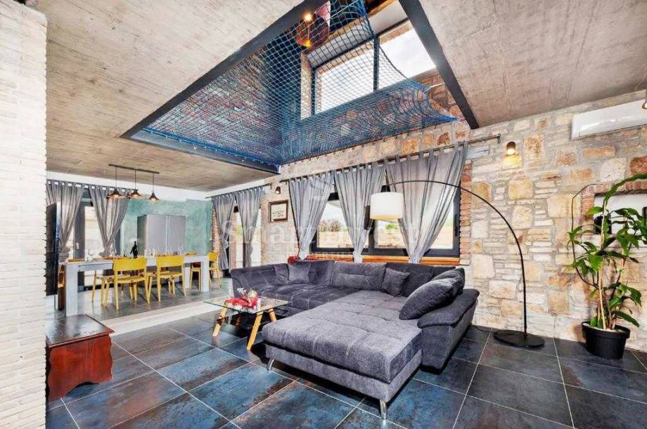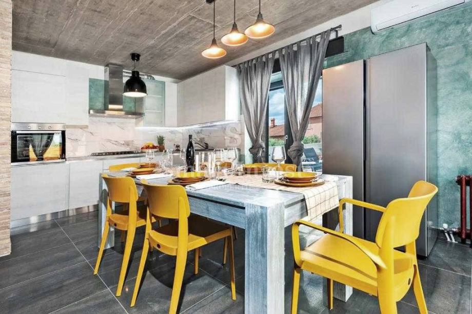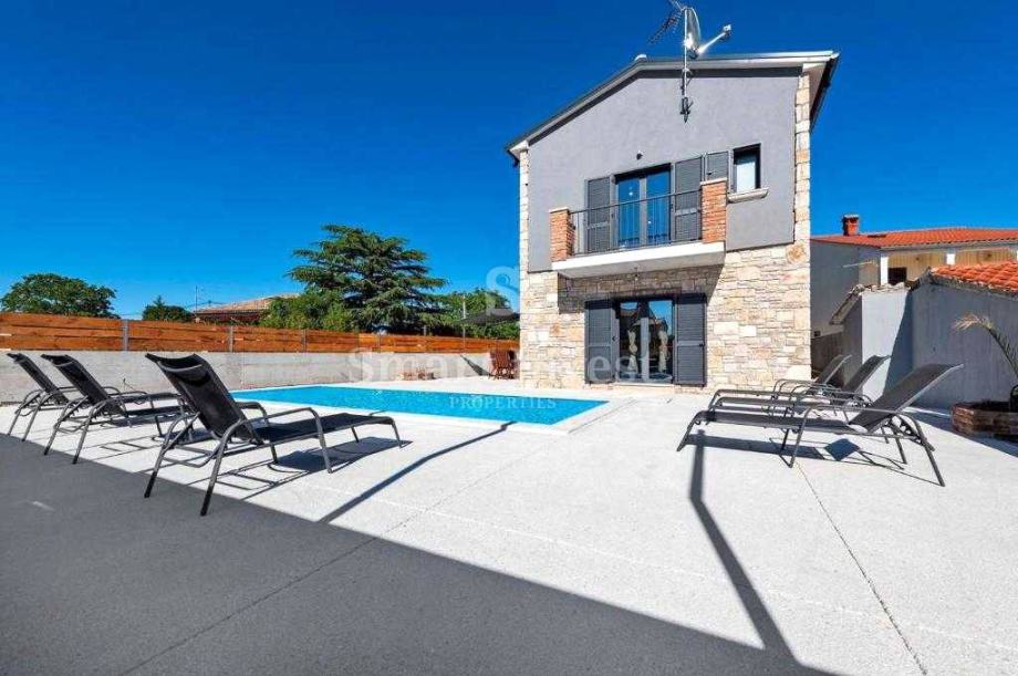 KANFANAR, prekrasna dizajnerski uređena vila s bazenom sa slanom vodom, u mirnom naselju udaljenom 15 minuta vožnje od Rovinja i rovinjskih plaža.