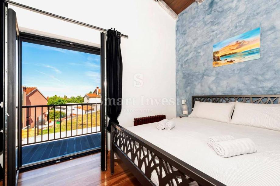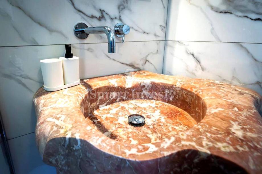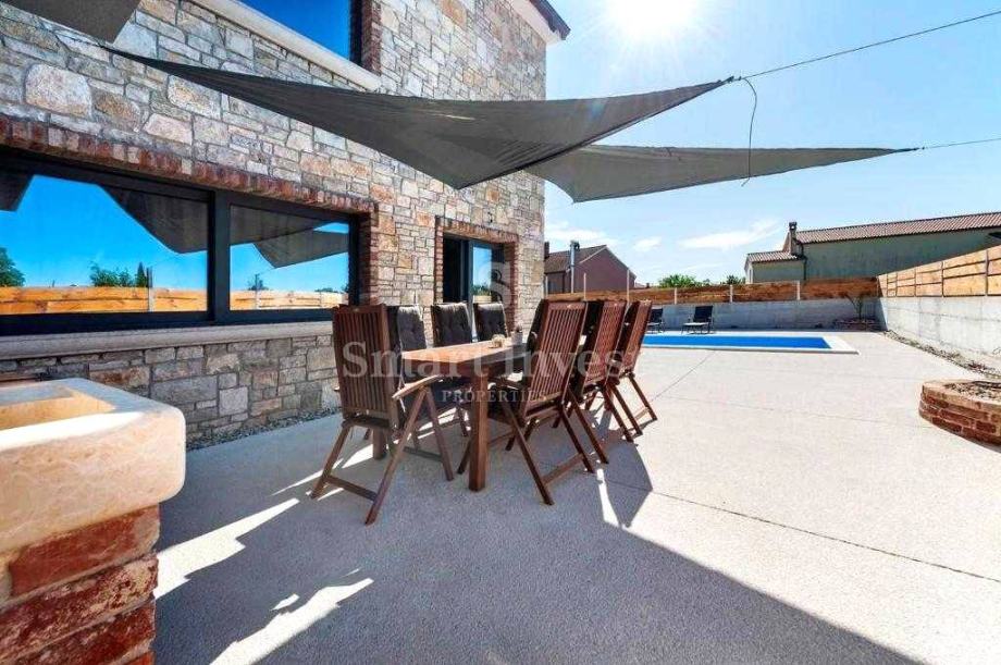 Na uređenoj i ograđenoj okućnici se nalazi bazen sa slanom vodom bez klora s hidromasažnom klupom te slapom, sunčalište, ljetna kuhinja, roštilj te više parkirnih mjesta.