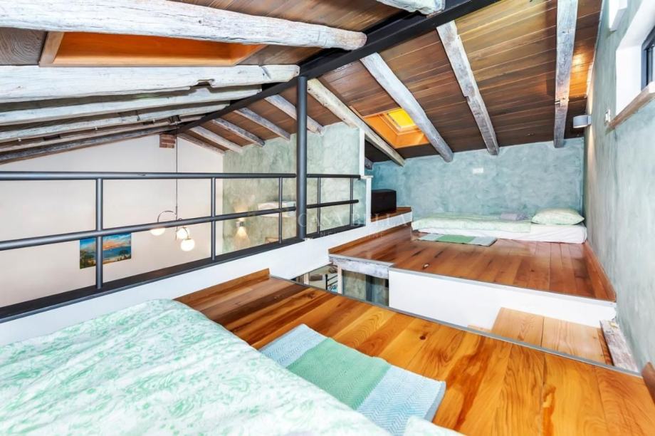 Prostire se na dvije etaže i površine je 240 m2 .U prizemlju se smjestio veliki dnevni boravak sa kaminom, kuhinja s blagovaonicom, spavaća soba te kupaonica.Na katu su još dvije spavaće sobe, obje s vlastitim kupaonicama i malim balkonom. Interijer vile opremljen je stilom i lijepim detaljima. Posebno će vam se svidjeti tradicionalni detalji poput kamene kante za pranje ili ribarskih mreža na stropu,lavandini koji su ručni rad ,željezne stepenice..Stolarija je aluminijska, s troslojnim staklom. Vila je opremljena centralnim sustavom usisavanja.Grijanje je podno + centralno na radijatore, klime u svim prostorijama .