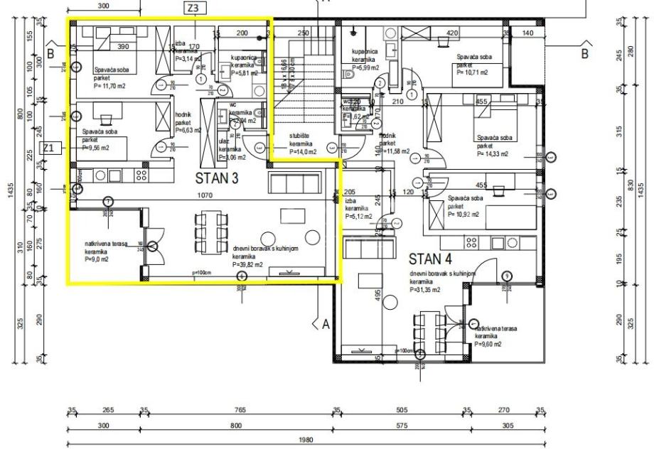 Stan će biti površine 90,76m2, nalaziti će se na prvom katu zgrade te će se sastojati od: