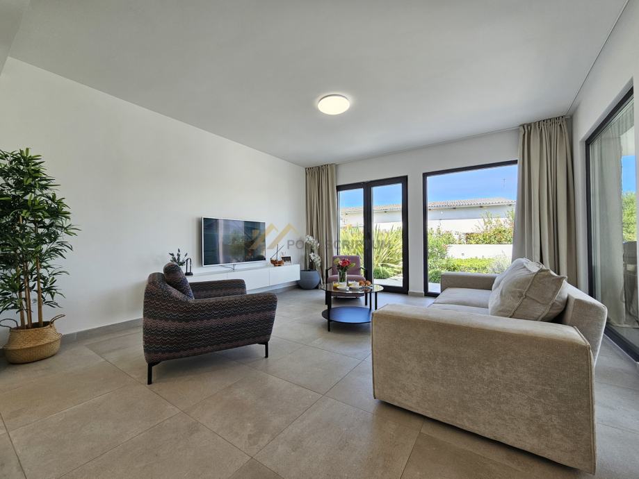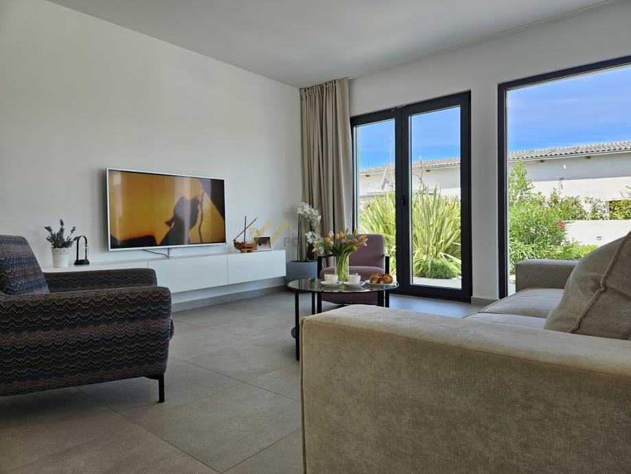 Na prvoj prizemnoj etaži nalaze se kuhinja, blagovaonica i prostran dnevni boravak te jedna spavaća soba s vlastitom kupaonicom.