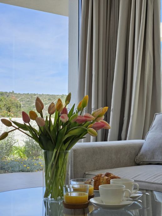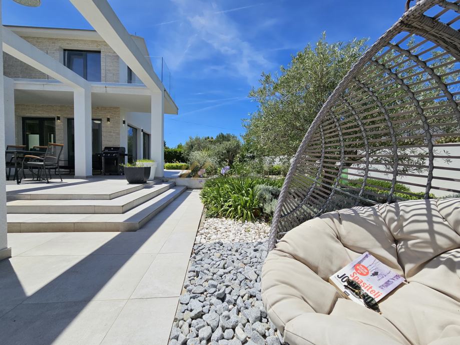 Terasa je opremljena garniturom za sjedenje s pogledom na vanjski bazen i mediteransko bilje koje krasi okućnicu i vrt.