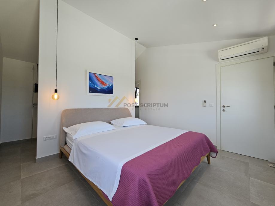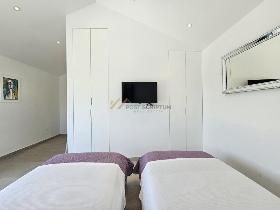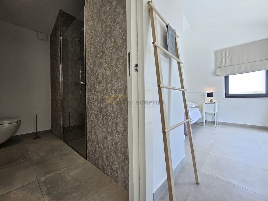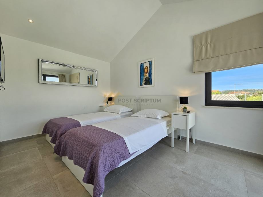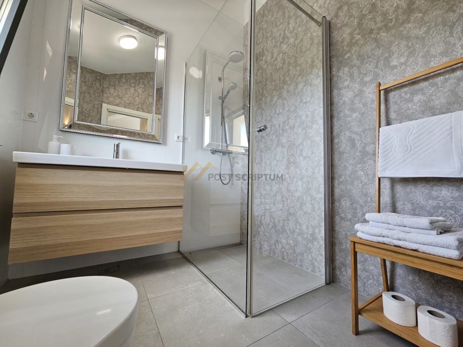 Na drugoj etaži nalaze se predsoblje, dvije spavaće sobe s vlastitim kupaonicama i terasa s predivnim pogledom.