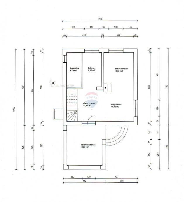 U prizemlju kuće u koji se ulazi kroz veliku natkrivenu terasu površine 13,32 m2, nalazi se veliki dnevni boravak s blagovaonicom, ulaznim dijelom, kuhinjom i kupaonicom.