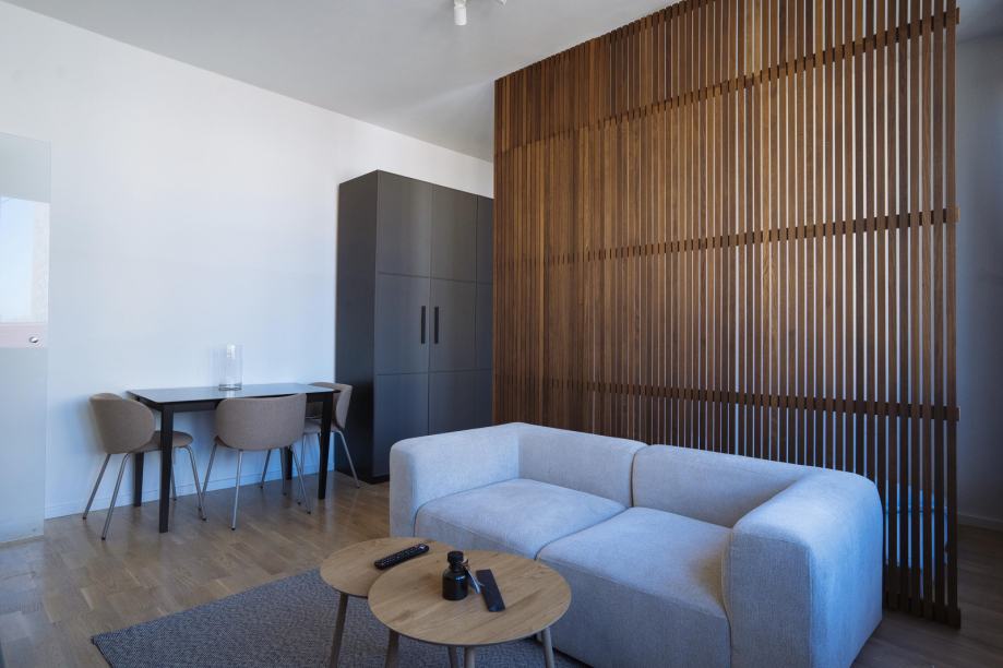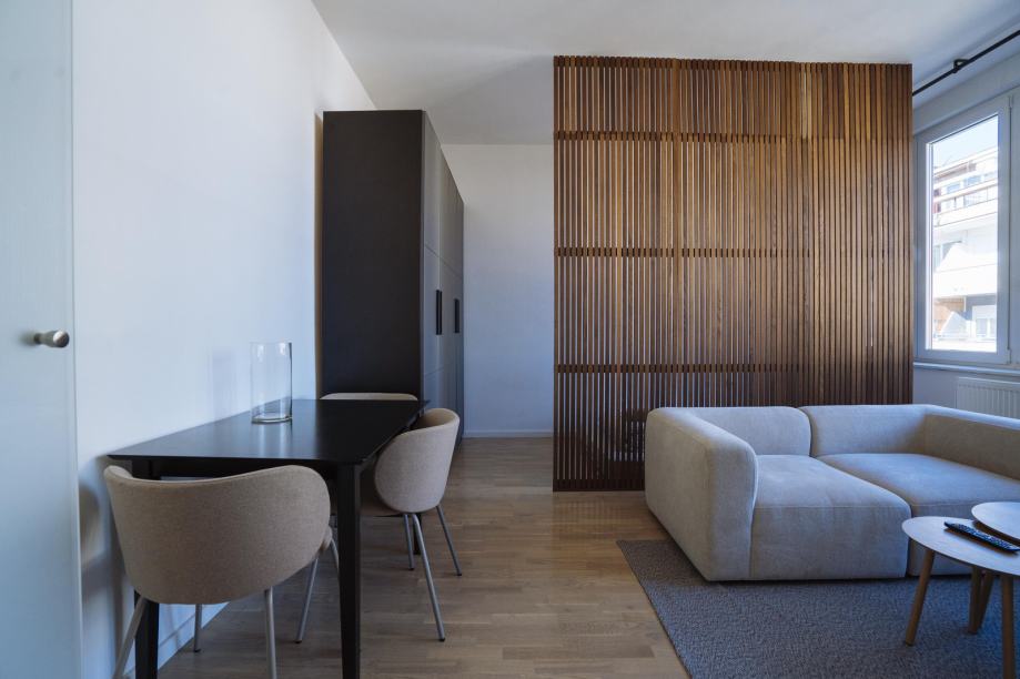 Stan se sastoji od: prostranog dnevnog boravka i spavaće sobe odvojene s pregradnim zidom od pravoga drva, odvojene kuhinje s izlazom na balkon, te kupaonice s prostranom walk-in kabinom.