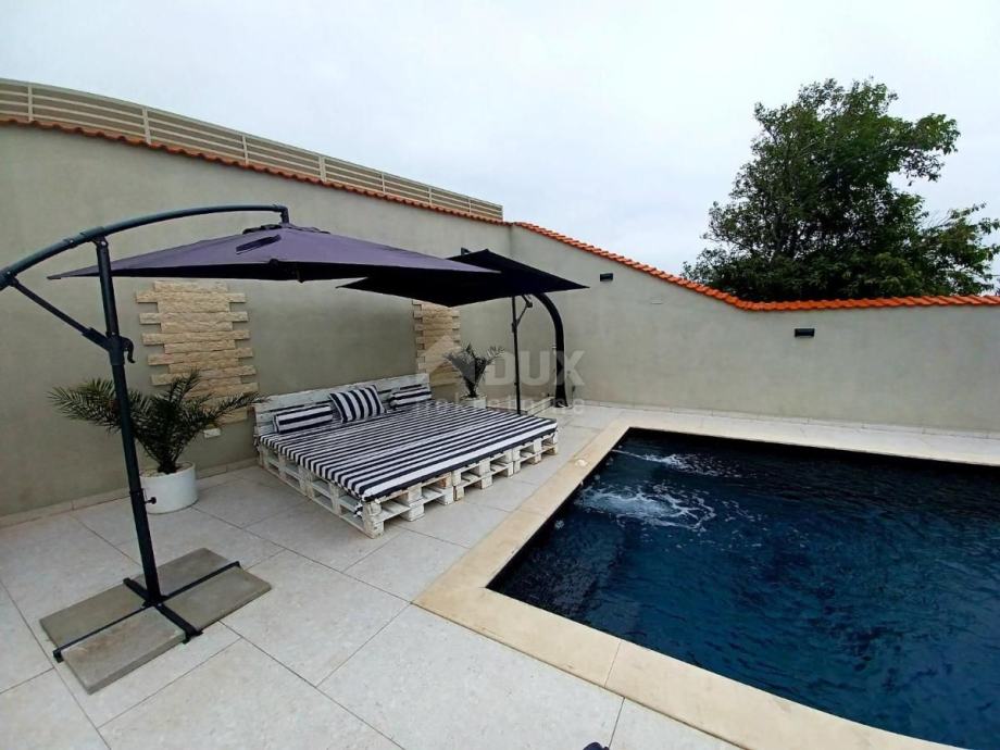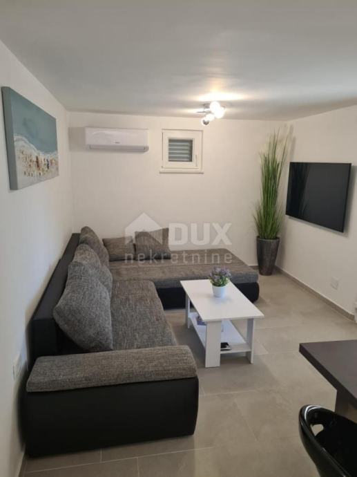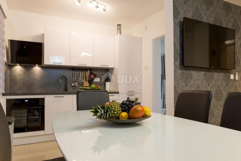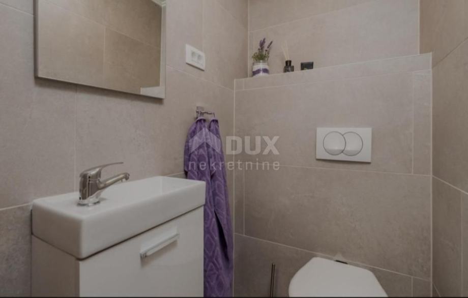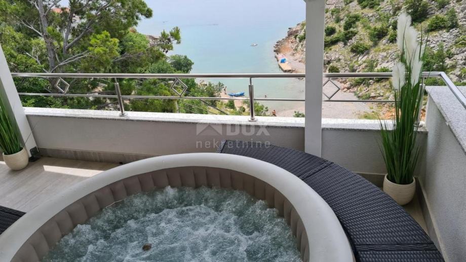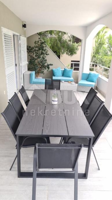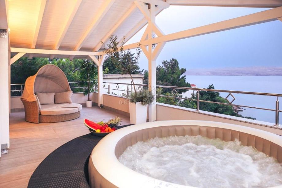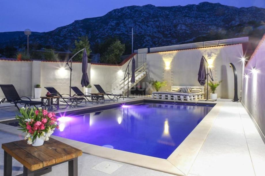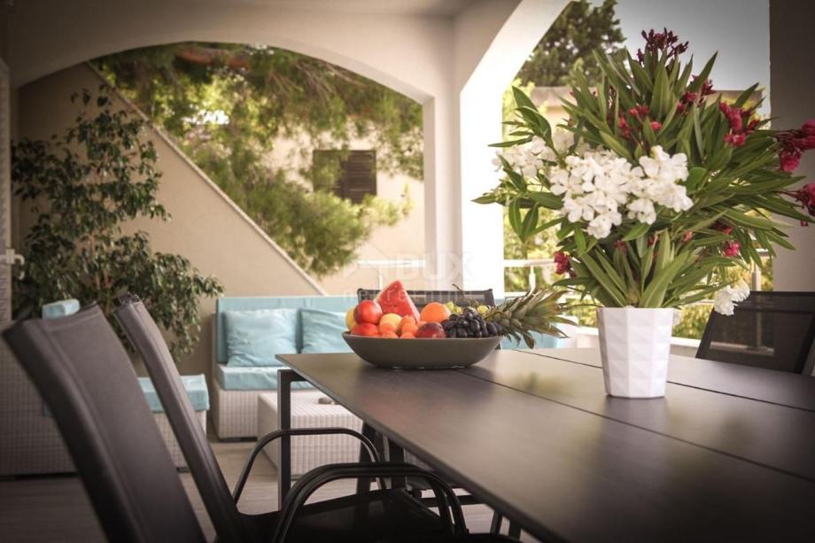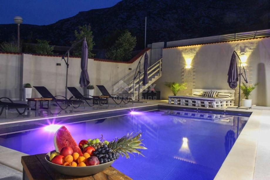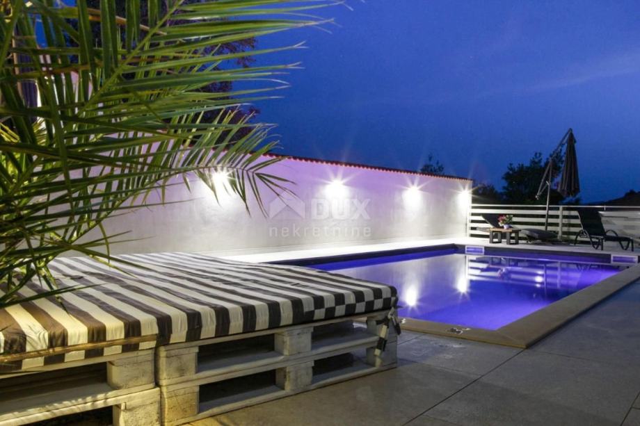 U prizemlju vile nalazi se ulaz u odvojeni apartman s jednom spavaćom sobom i kupaonicom, dodatnim WC-om, kuhinjom, blagovaonicom, dnevnim boravkom i terasom. Na prvom katu je ulaz u drugi dio vile gdje se nalazi prostrani dnevni boravak, moderno uređena kuhinja, blagovaona, predsoblje, jedna spavaća soba, kupaonica i prostrana terasa. Na drugom katu nalaze se tri spavaće sobe, kupaonica i velika terasa s jacuzzijem i pogledom na more. Sve sobe su klimatizirane i opremljene su smart televizijom. U dvorištu vile nalazi se prostrano sunčalište, veliki bazen s pripremom za grijanje i protustrujno plivanje. U dvorištu se nalazi i roštilj te parking s tri privatna parkirna mjesta.