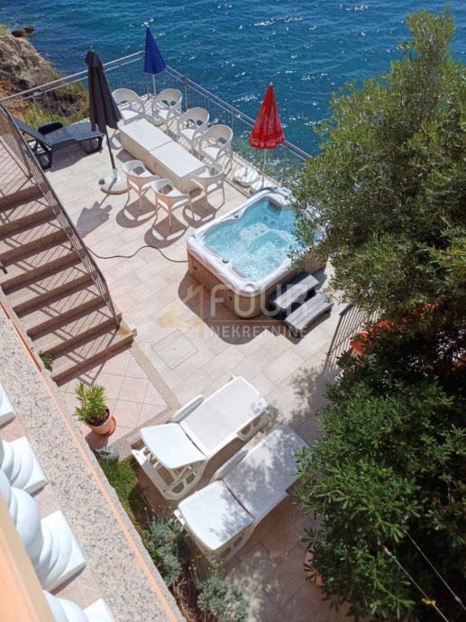 Okoliš je lijepo uređen, na njemu se nalazi još jedna terasa na kojoj je smješten jacuzzi, od terase se spušta prema moru i uređenoj plaži gdje se nalazi mali dječji bazeni roštilj.