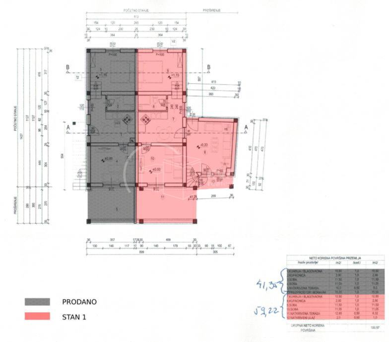 Stan sadrži 3 prostorije, kupatilo sa toaletom i terasu. Stambena površina ovog stana je 59,22m2.