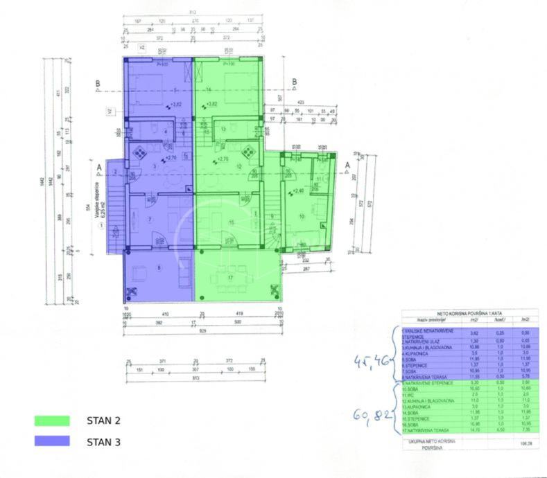 Stan sadrži dvije stambene jedinice i to 2S stan od 48,22 i studio apartman od 12,60m2. Veća stambena jedinica izlazi na prostrani balkon.