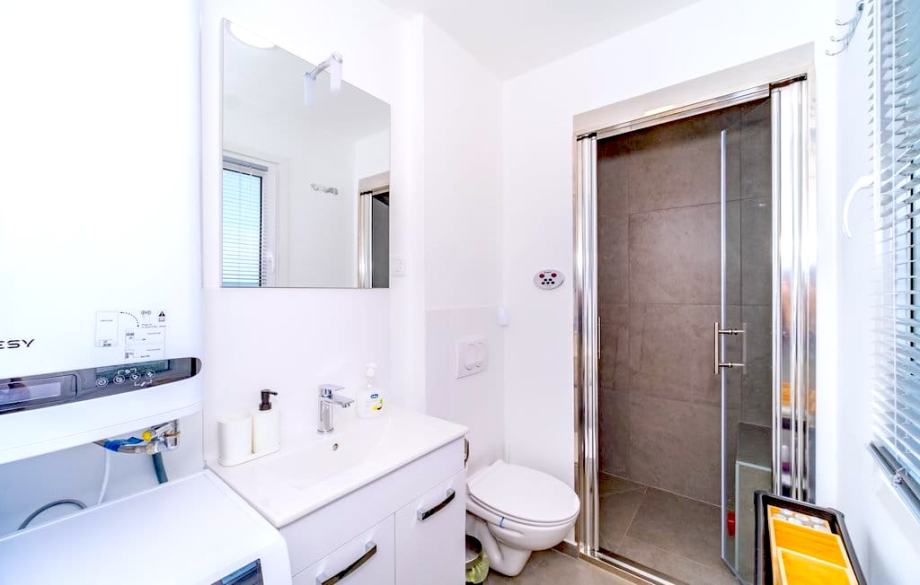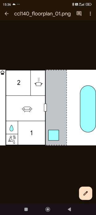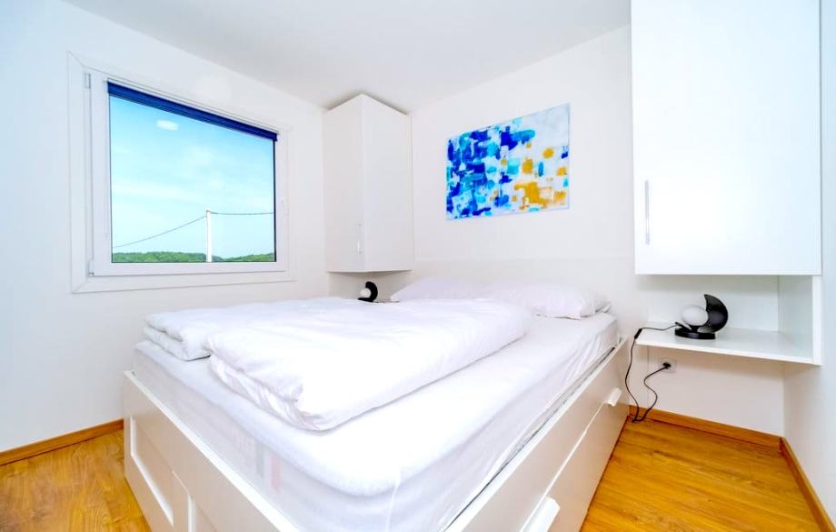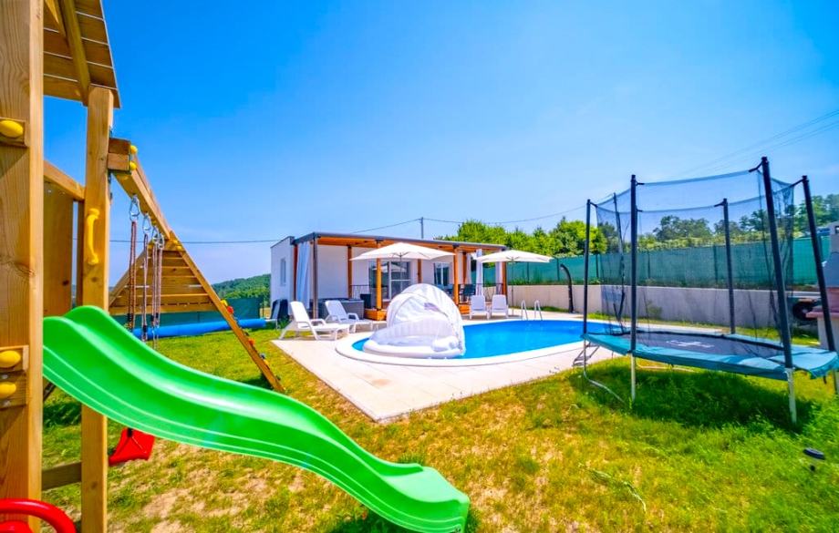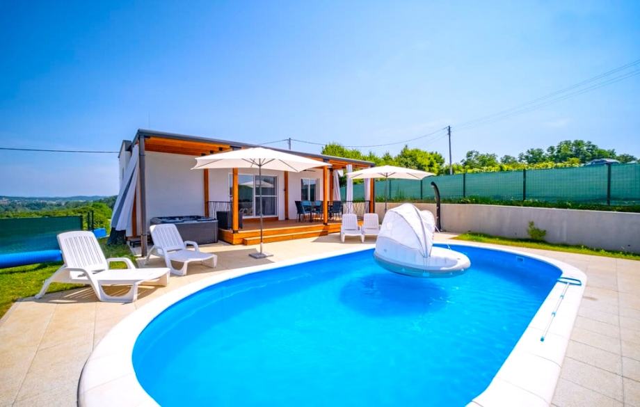 Kućica se sastoji od dnevnog boravka i blagovaonice, kuhinje, dvije spavaće sobe, kupaonice sa tuš kabinom i saunom. Ispred je velika natkrivena terasa koja se proteže duljinom cijelog objekta te se na njoj nalaze jacuzzi i mjesto za druženje, tu je još i grijani bazen, vanjski roštilj, spremište…
