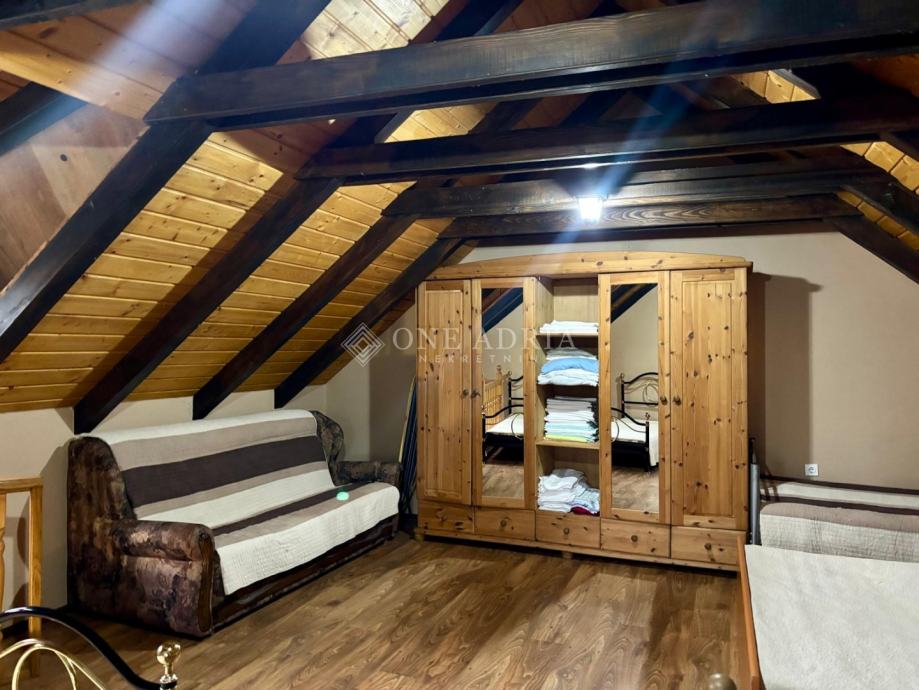 Ljepotu ove kuće čini prostrana terasa, kao i balkon, koji omogućuju uživanje na svježem zraku tijekom cijelog dana. Vanjski prostor dodatno je obogaćen pečenjarom, kotlićem te roštiljima na plin i drva. Na velikoj terasi nalazi se masivni stol sa stolicama za dvadeset osoba, što ovu nekretninu čini idealnom za obiteljska okupljanja i druženja. Kuća raspolaže s ukupno deset kreveta, što pruža mogućnost smještaja većeg broja osoba.