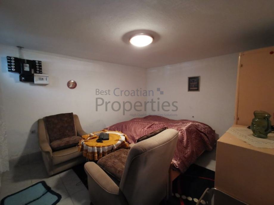 Vanjskim stepenicama, na katu se nalaze dvije sobe (spavaća i dnevna), kuhinja i kupaona.