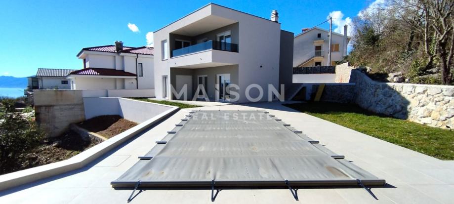 U mirnom dijelu Kastva, na prostranoj parceli od 700 m², smještena je samostojeća kuća modernog koncepta, ukupne površine 185 m², s bazenom i otvorenim pogledom na more koji ostavlja bez daha.