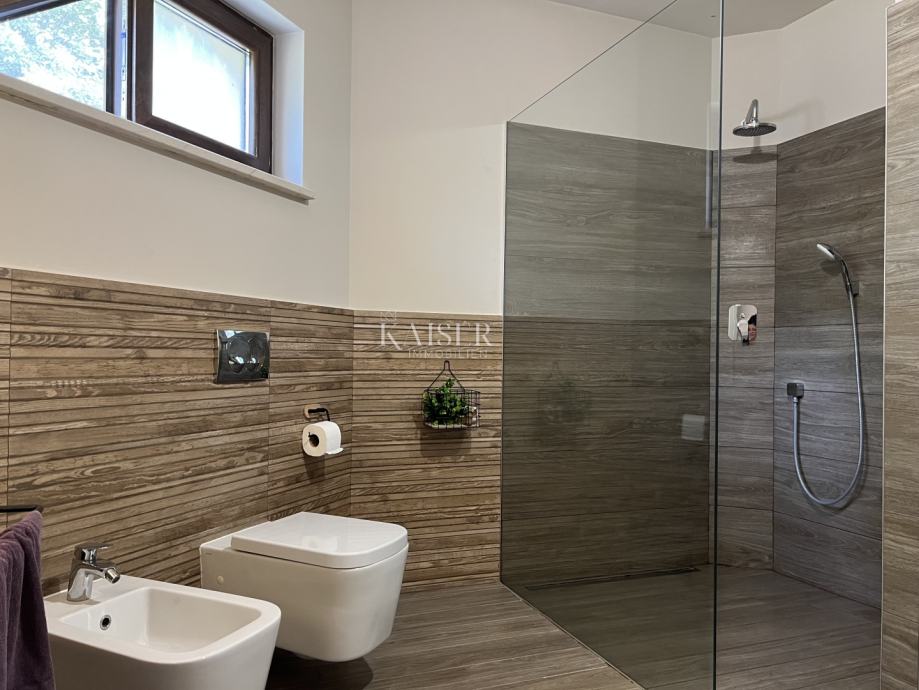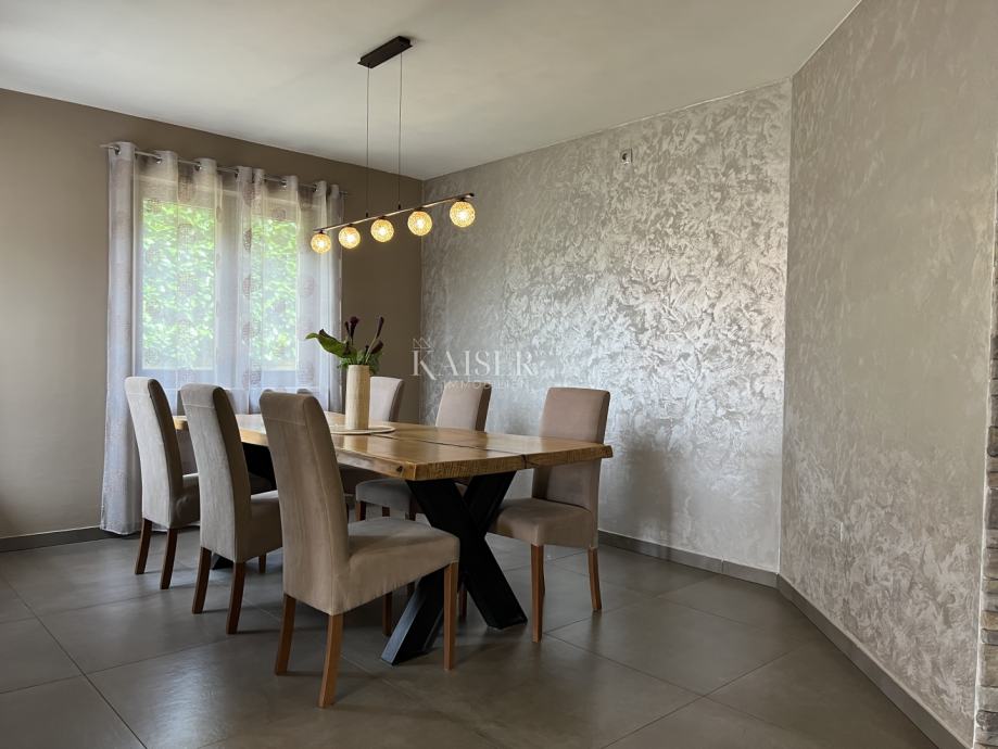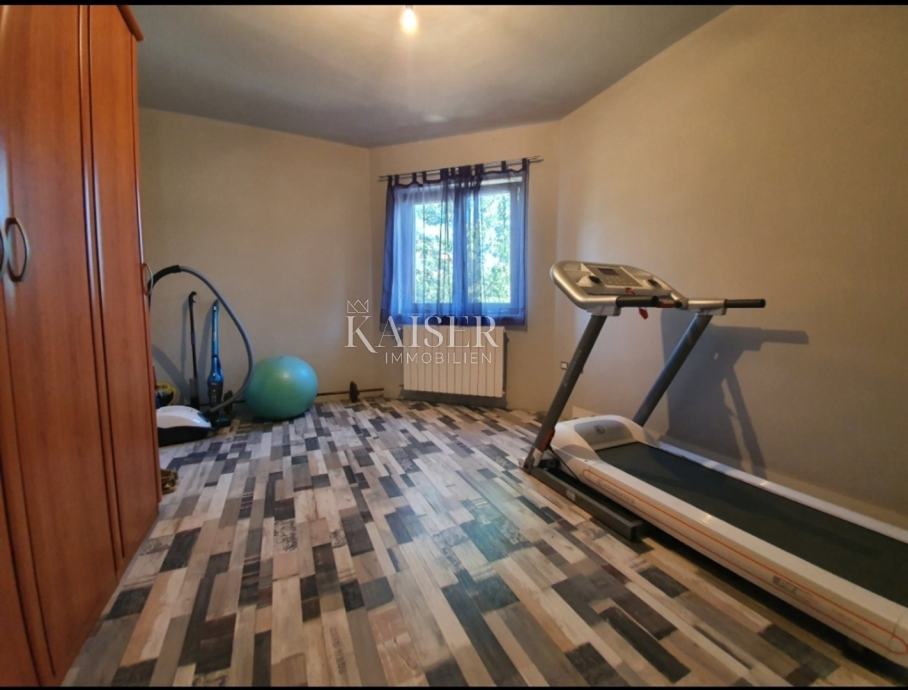 U prizemlju imamo spavaću sobu, kupaonica, ostavu, veliki dnevni boravak, blagovaonicu i kuhinju te izlaz u garažu u kojoj se nalazi i kotlovnica za centralno grijanje na drva. Na katu se nalaze tri spavaće sobe od kojih svaka ima izlaz na veliku terasu s koje se pruža pogled na okolinu i Kastav, te velika kupaonica.
