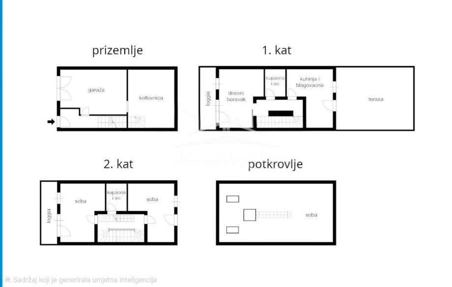 U prizemlju se nalazi velika garaža dio se koristi za parking dio za kotlovnicu i spremište za drva.