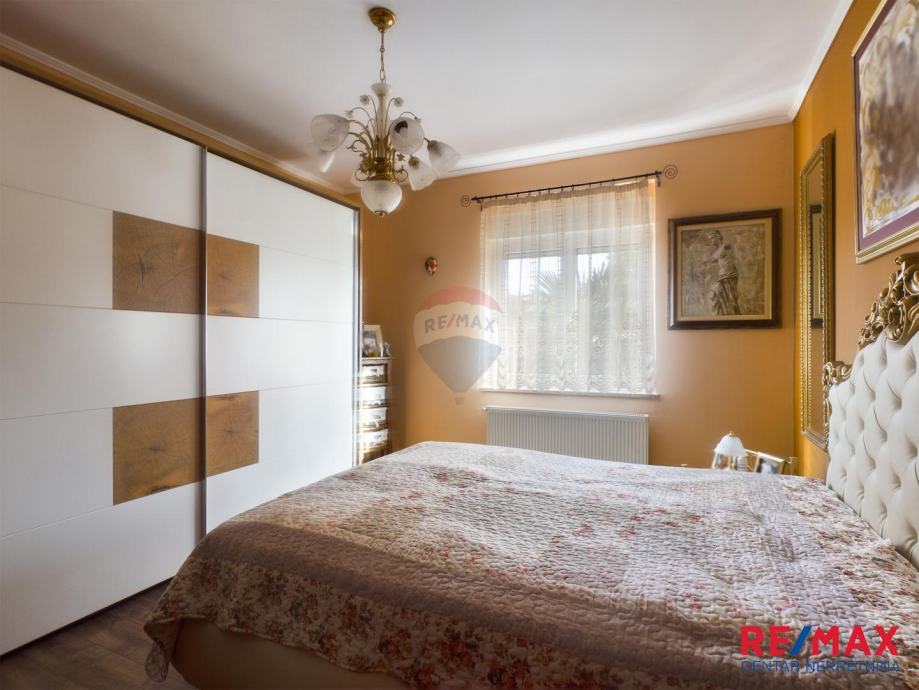 U prizemlju kuće se nalazi stan površine 88m2 koji se sastoji od kuhinje s blagovaonom i dnevnim boravkom, dvije spavaće sobe, kupaone, hodnika, spremišta i natkrivene terase.
