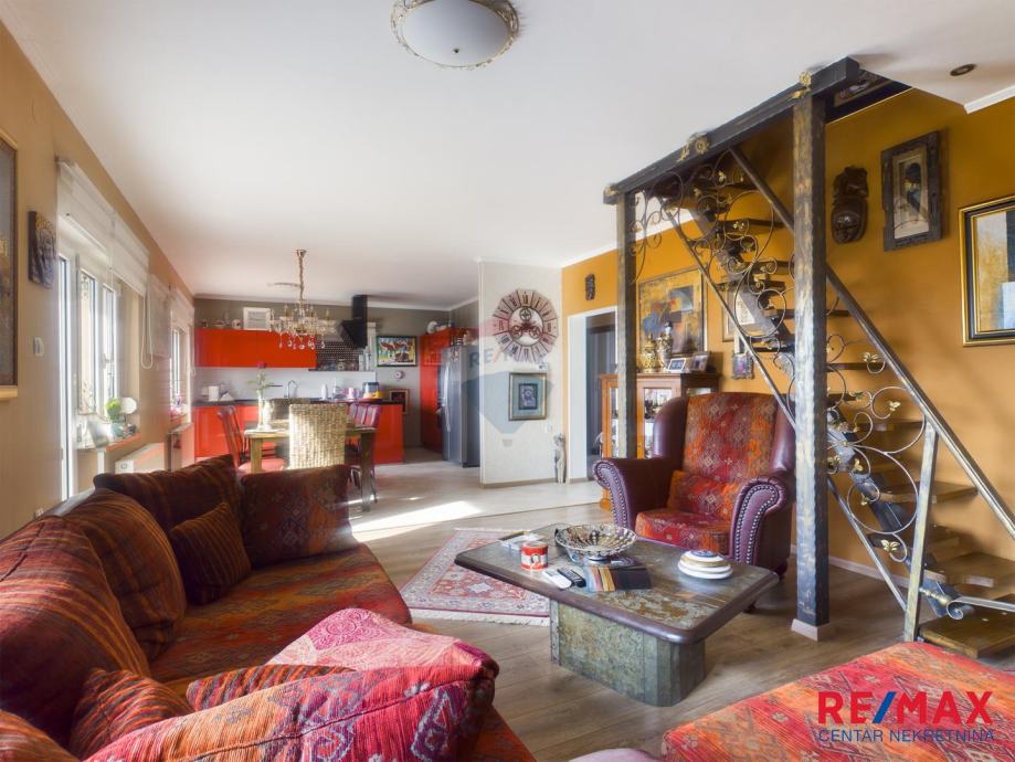 Na katu je dvoetažni stan; na donjoj etaži nalazi se terasa, lođa, hodnik, spremište, kupaona, spavaća soba, dnevni boravak s kuhinjom i blagovaonom te stepeništem koje vodi u potkrovlje gdje se nalazi još jedna soba, kupaona, spremište i terasa.