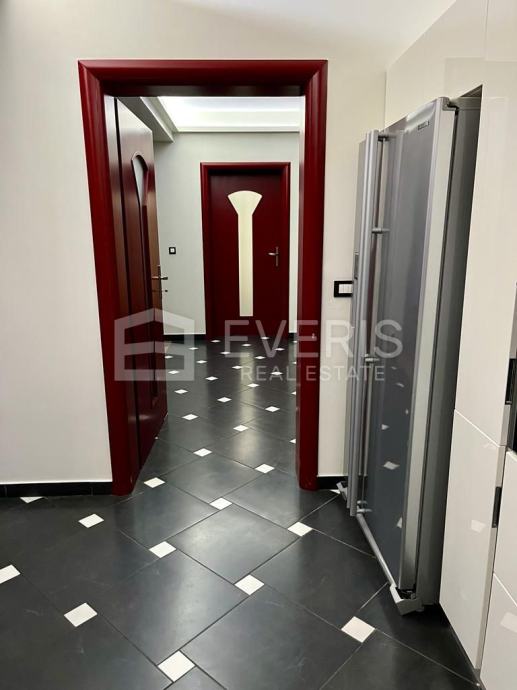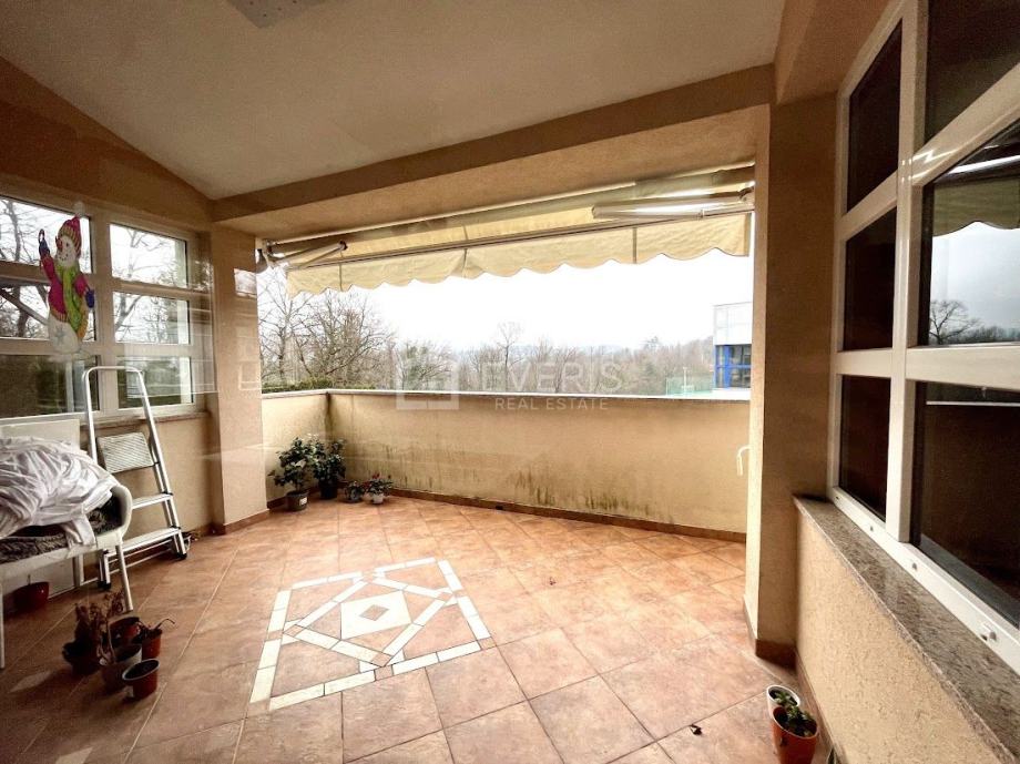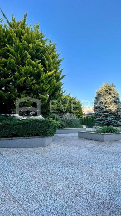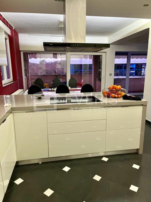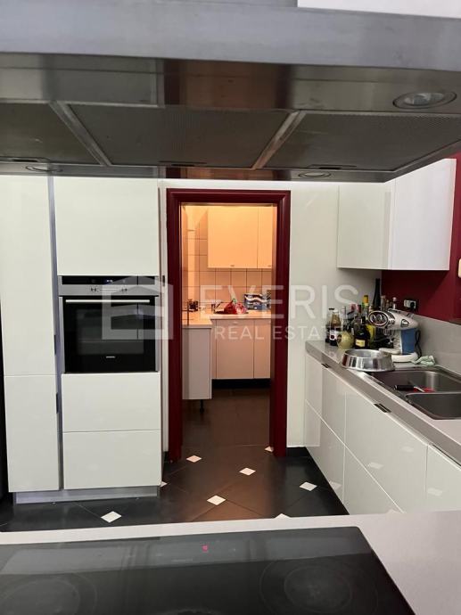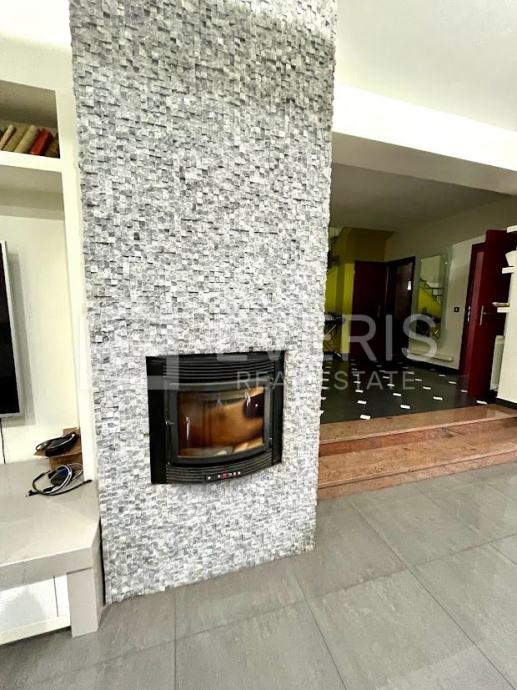 Prizemlje nudi udoban dnevni boravak, okupan svijetlošću zahvaljujući velikim staklenim stijenama duž cijele dužine prostorije iz kojeg se izlazi na balkon. Kamin u prostoru stvara posebnu ugodnu atmosferu. Elegantna Scavolini kuhinja opremljena po mjeri i blagovaona dio su prizemlja, kao i soba za goste i kupaonica.
