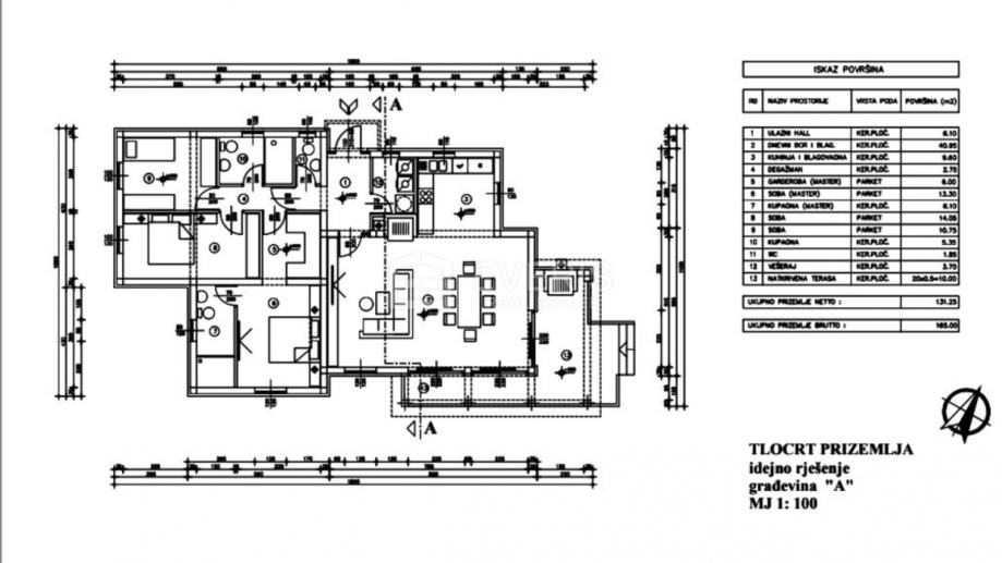 Ukupna neto površina nekretnine 131,25; bruto kvadratura: 165 m2.