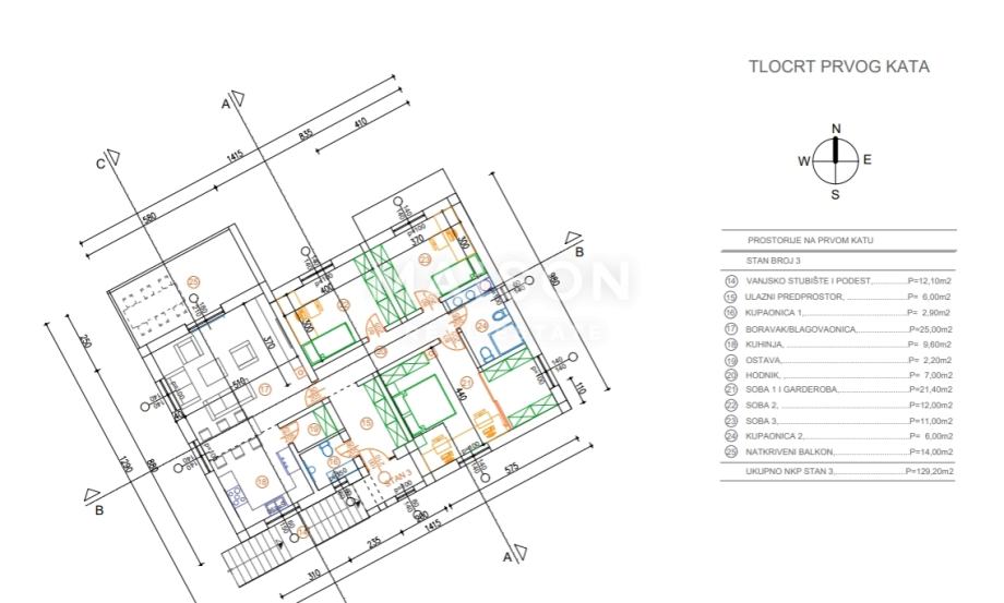 U ponudi je trosoban stan na prvom katu manje novogradnje s ukupno tri stana, ukupne površine 142,8 m², površina stana iznosi 116,2 kvadratnih metara.