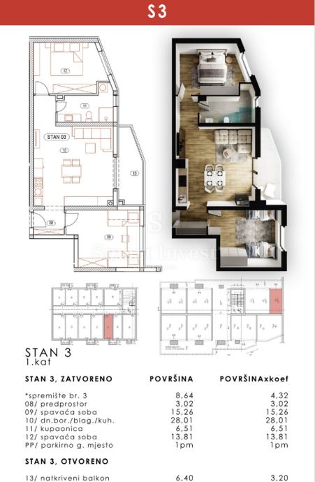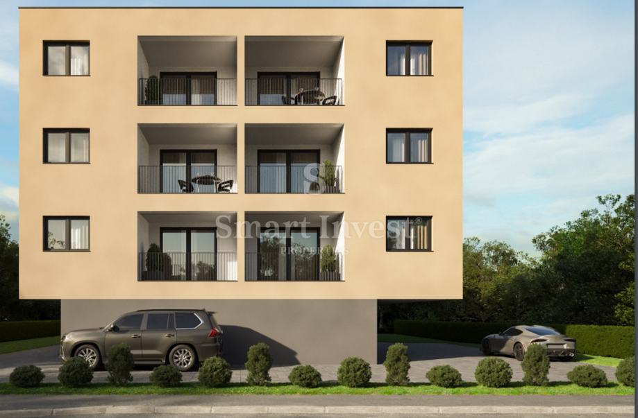 Stan se nalazi na prvom katu trokatnice a sastoji se od 2 spavaće sobe, kuhinje , blagovaonice i dnevnog boravka, kupaonice, predprostora, spremišta, lođe i jednog parkirnog mjesta u garaži i jednog vanjskog parkirnog mjesta.