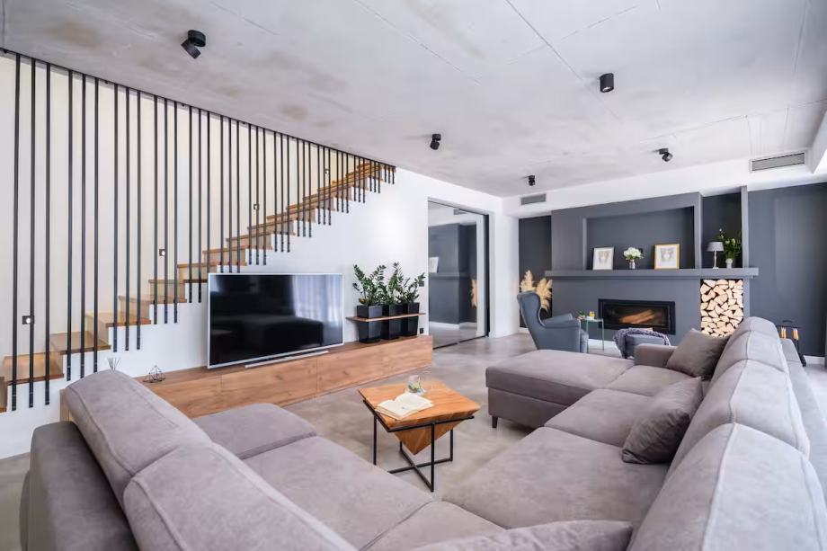 Budući da se radi o novoizgrađenoj nekretnini, dizajner pratio je najnovije trendove i posebno vodio računa o detaljima. Linije su jasne, a dominantni materijali su staklo, drvo i čelik. Klima je dostupna u cijeloj vili i svakoj spavaćoj sobi.