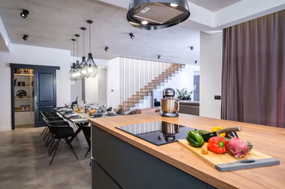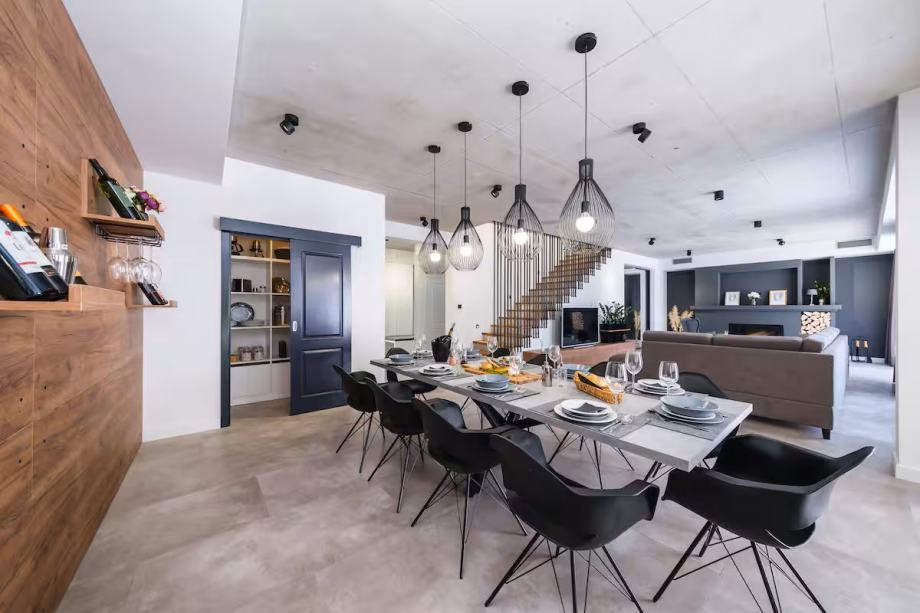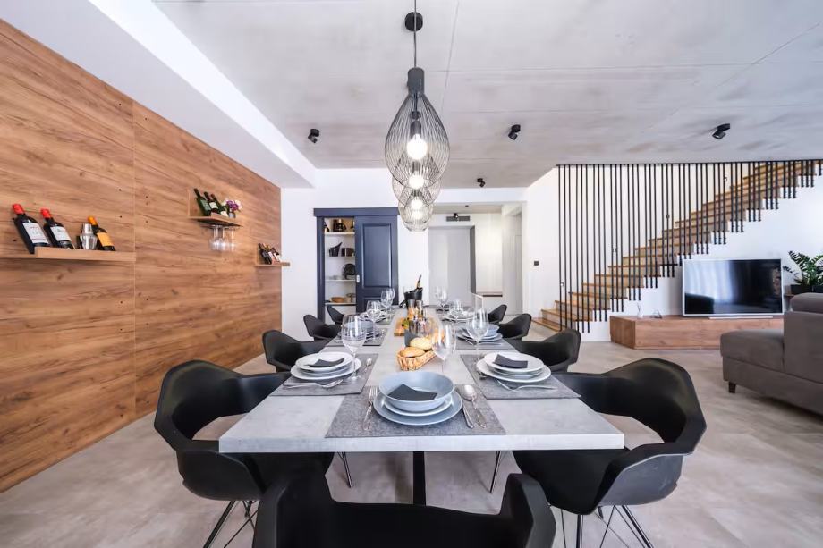 Iz potpuno opremljene kuhinje prolazite pored vinskog zida i blagovaonice dolazi se do dnevnog boravka u kojem se nalazi TV prostor i kamin.