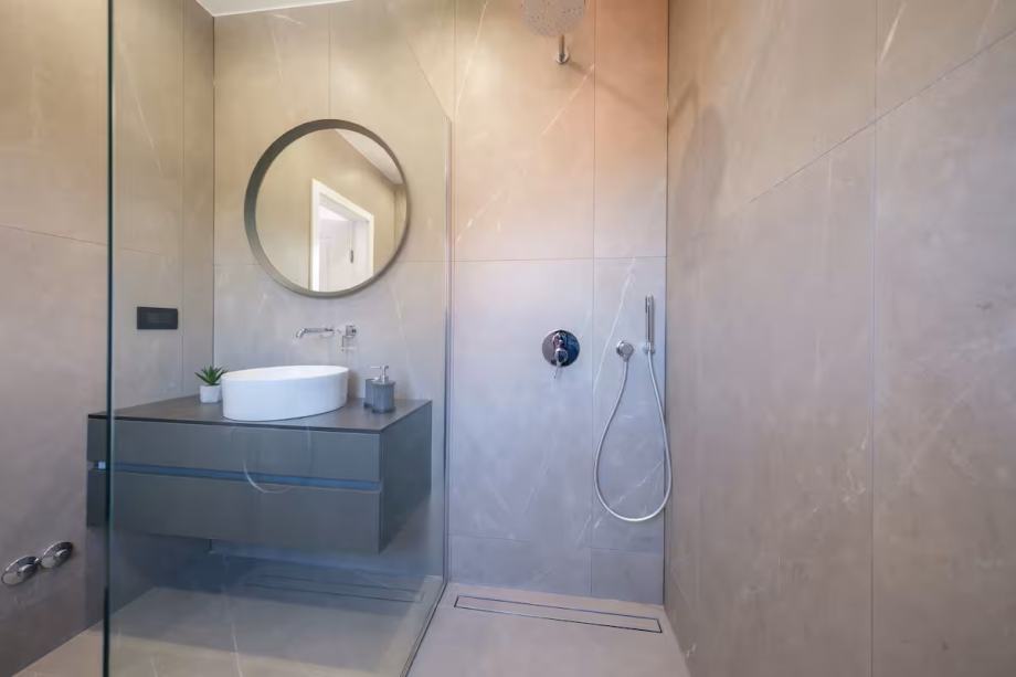 Budući da se radi o novoizgrađenoj nekretnini, dizajner pratio je najnovije trendove i posebno vodio računa o detaljima. Linije su jasne, a dominantni materijali su staklo, drvo i čelik. Klima je dostupna u cijeloj vili i svakoj spavaćoj sobi.
