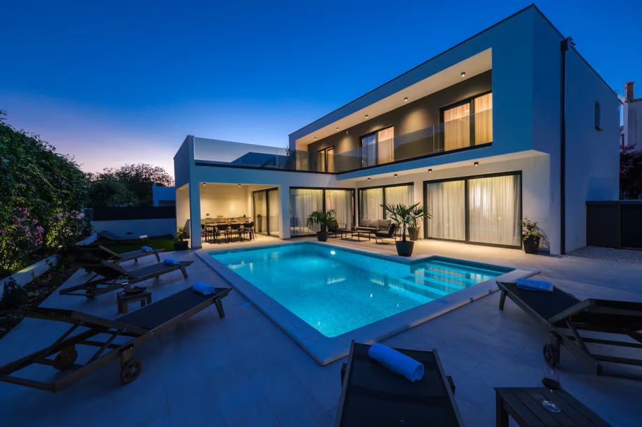 Imanje predstavlja modernu arhitekturu i dizajn, a naglasak je na unutarnjem i vanjskom životu, s primamljivim grijanim bazenom okruženim jednom od dvije terase za sunčanje. Druga se nalazi na katu vile. Visoki stropovi posvuda, s krovnim prozorima na drugom katu, ostavljaju dojam prostornosti, opuštajuće ugode i luksuza kakav se rijetko nudi. Mnogo je mjesta za zabavu budući da ova nekretnina nudi sve što možete zamisliti. Osim sunčališta s ležaljkama, izvana imate tri sjedeća prostora, a iznutra možete uživati s prijateljima i obitelji ili se jednostavno opustiti u bazenu.
